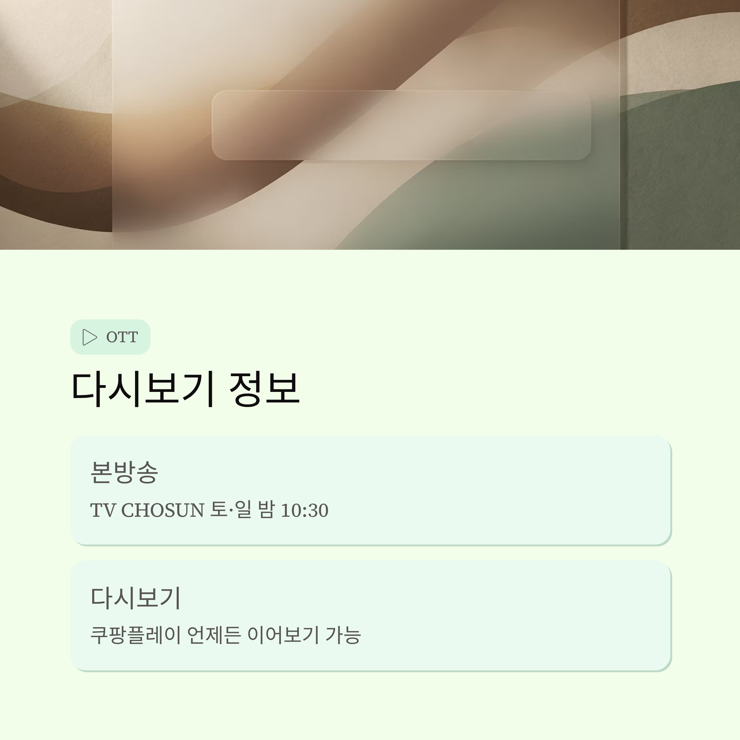 본방송을 놓쳤다면 쿠팡플레이에서 다시보기가 가능합니다. 방송은 TV CHOSUN 토·일 밤 10시 30분 편성이며, OTT 시청 수요도 함께 높은 편입니다. 본방 시간에 보기 어렵다면 쿠팡플레이를 이용해 이어보는 방식이 가장 편합니다.