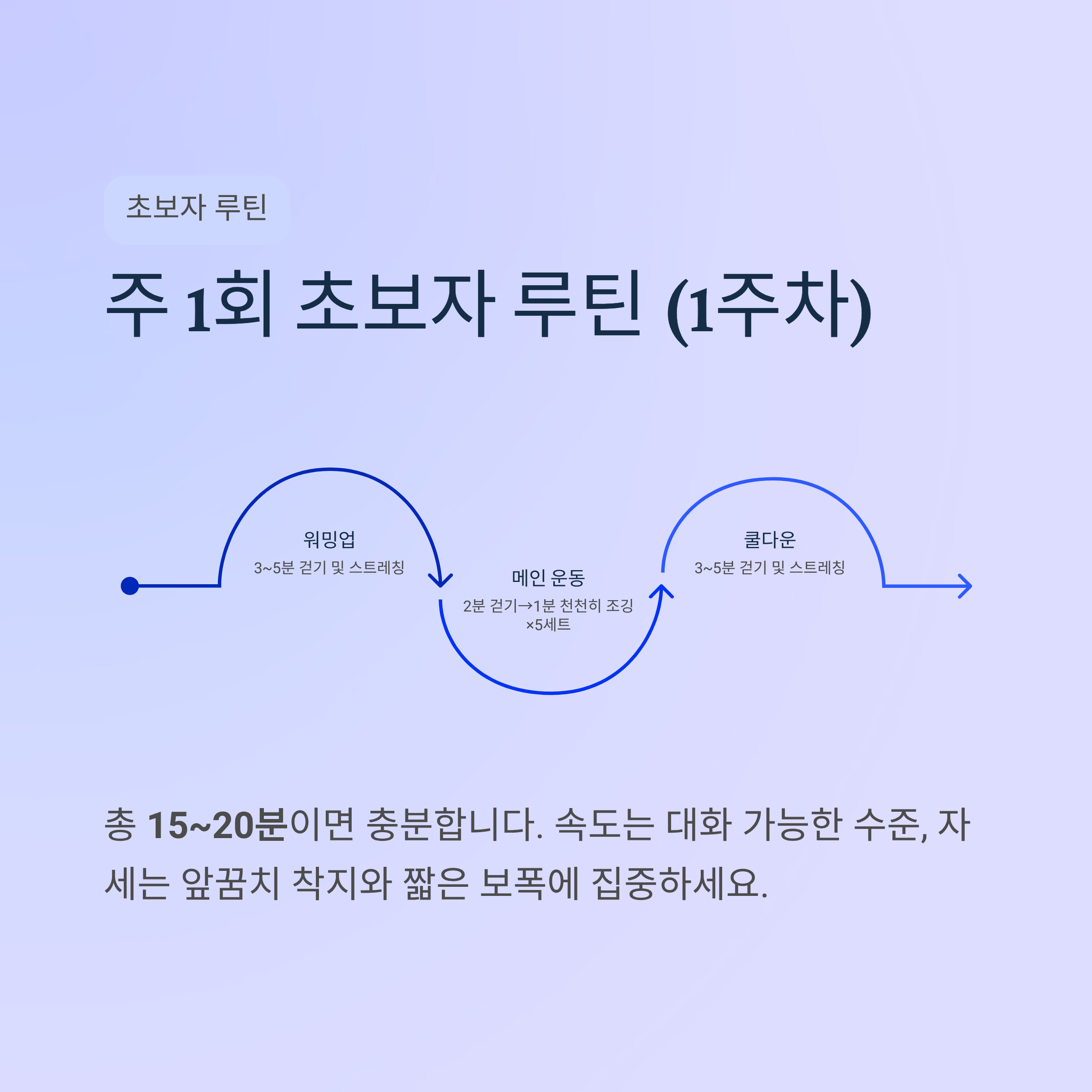 장소는 언덕보다 공원, 운동장, 트랙, 평지 산책로처럼 바닥이 안정적인 곳이 좋습니다.