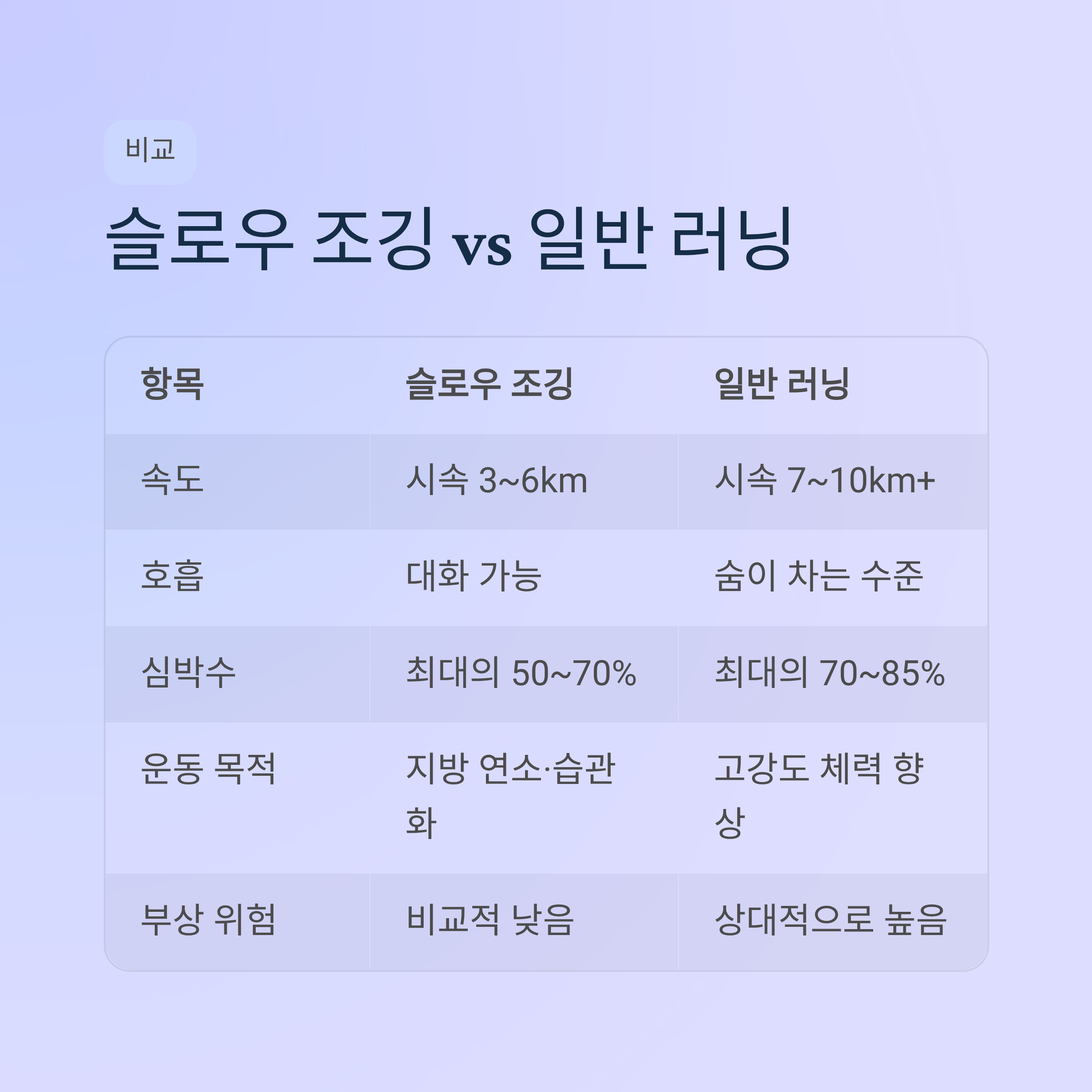 | 항목 | 슬로우 조깅 | 일반 러닝 |