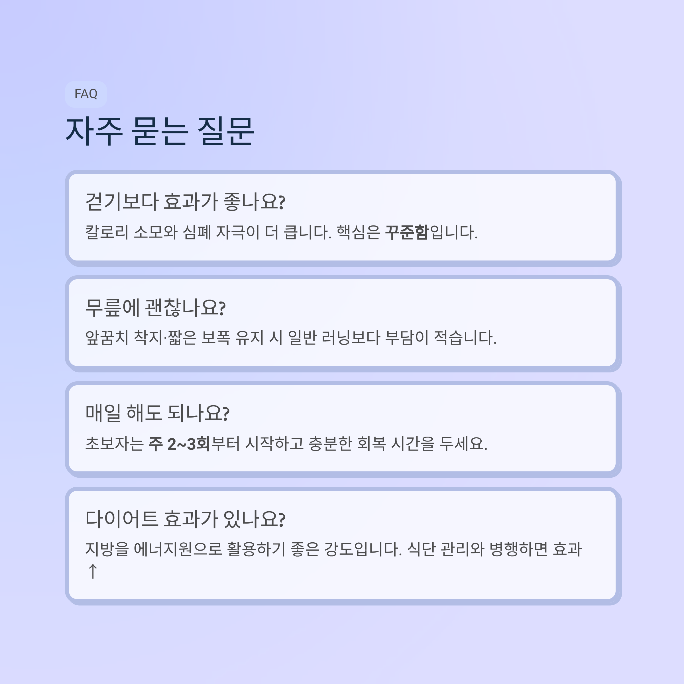 올바른 자세와 짧은 보폭, 앞꿈치 착지를 유지하면 일반 러닝보다 관절 부담이 적은 편입니다. 다만 기존 통증이 있다면 무리하지 말아야 합니다.