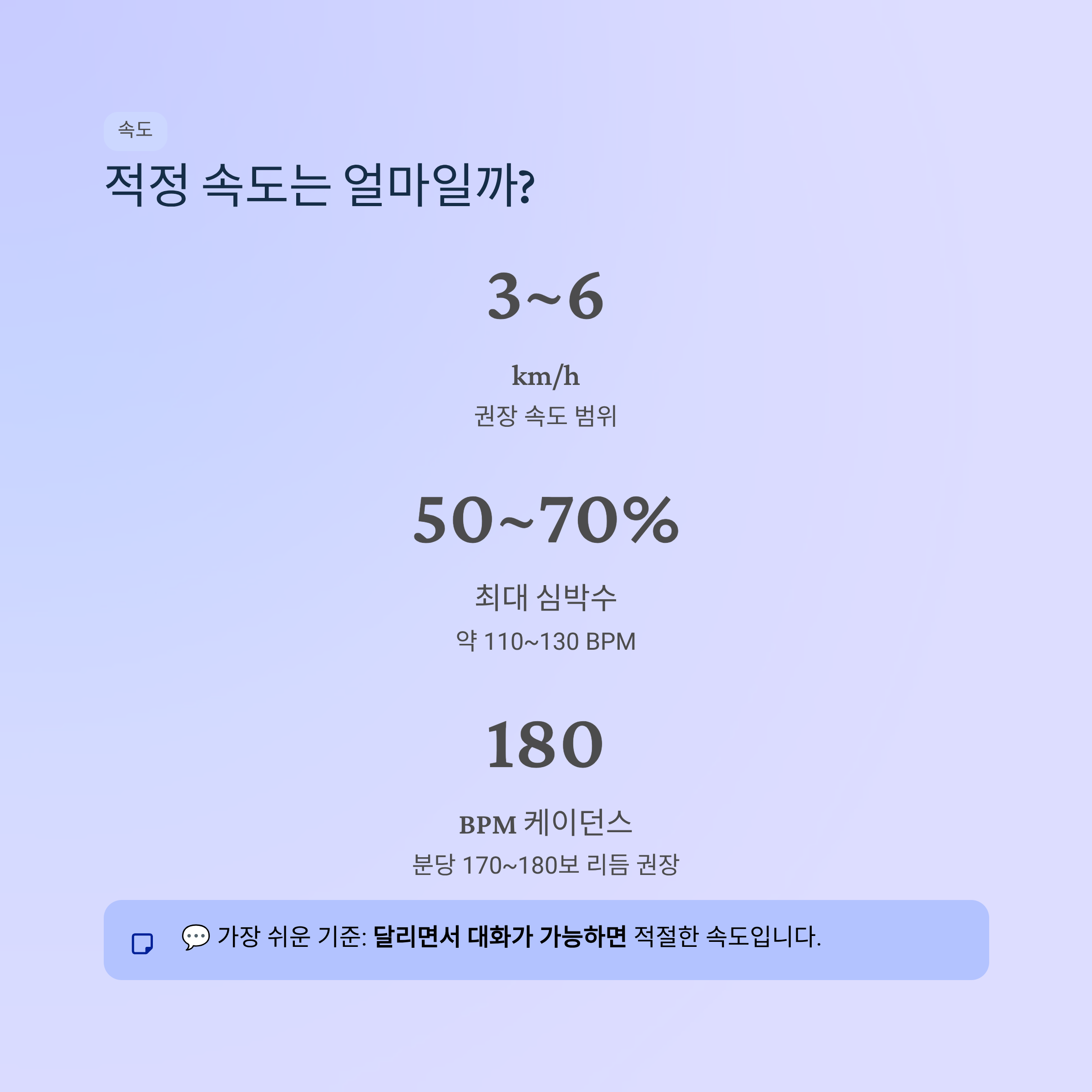 숨이 차서 말을 못 할 정도가 아니라, 옆 사람과 대화가 가능한 수준으로 달리는 것이 핵심입니다.