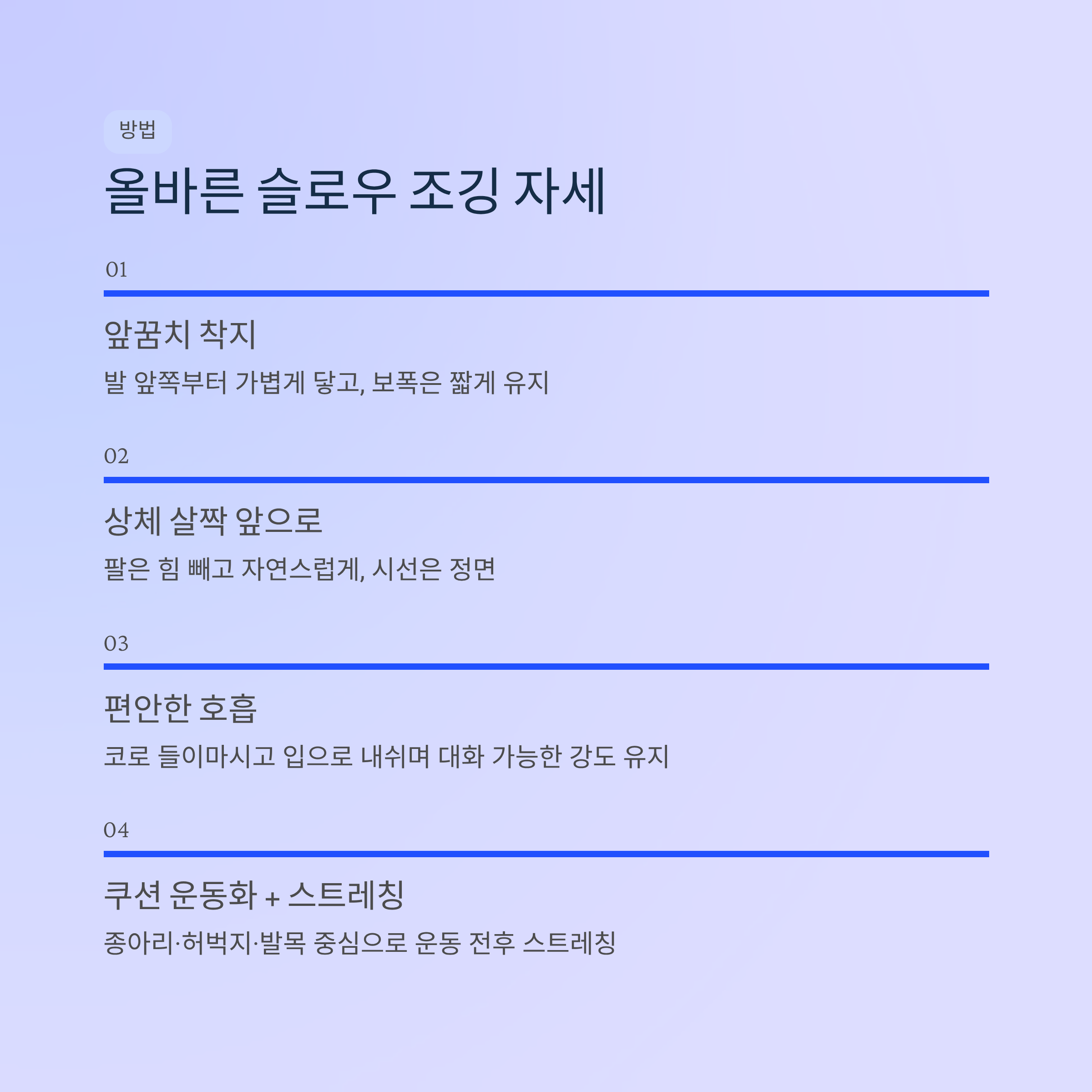 슬로우 조깅은 단순히 천천히 뛰는 것 같지만, 실제로는 자세와 리듬이 중요합니다. 올바른 방법으로 해야 관절 부담을 줄이고 오래 지속할 수 있습니다.