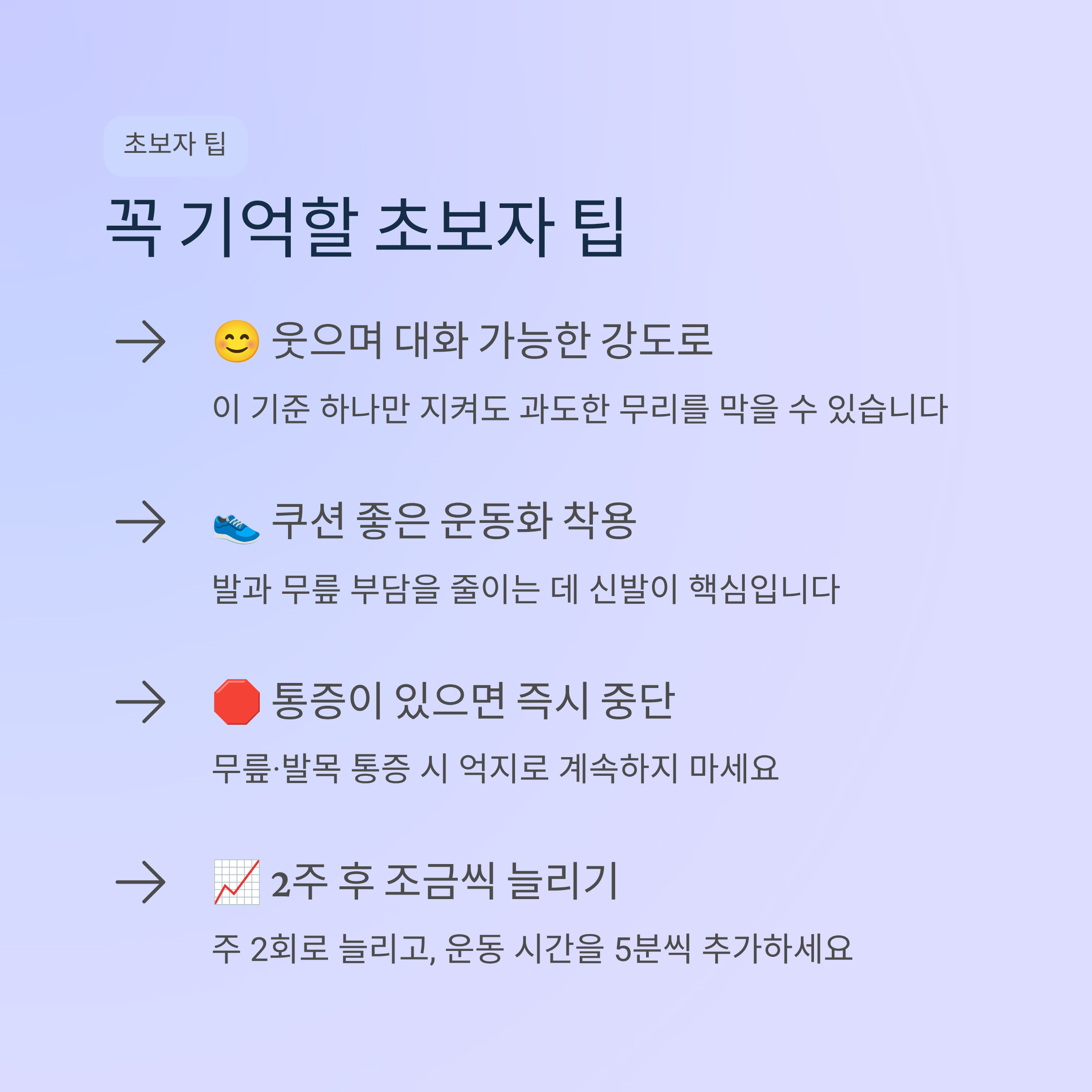 특히 운동 초보자, 체중 감량이 필요한 사람, 무릎 부담이 걱정되는 사람에게 잘 맞는 방식입니다.