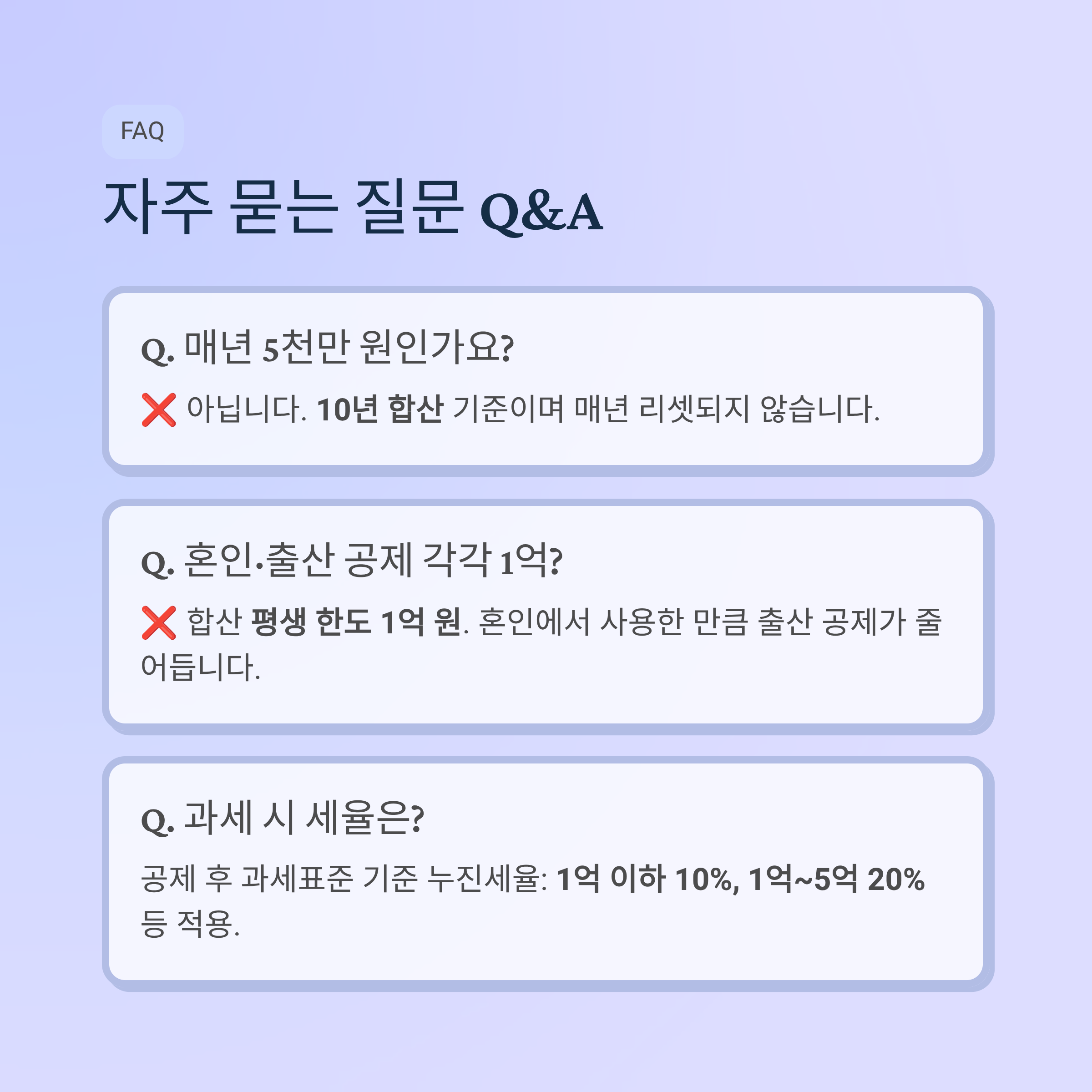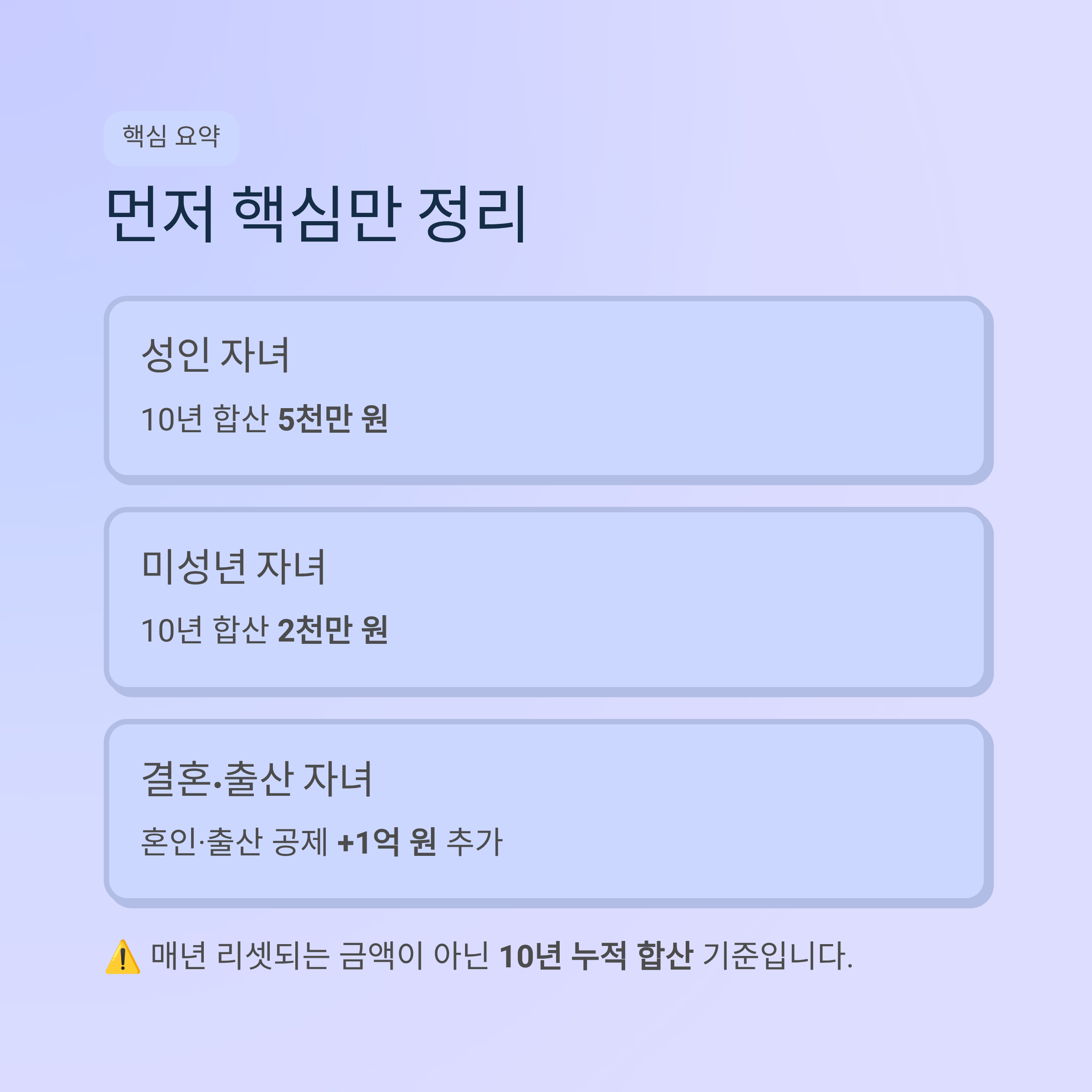 - 혼인·출산 공제는 수증자 기준 평생 한도 1억 원입니다.