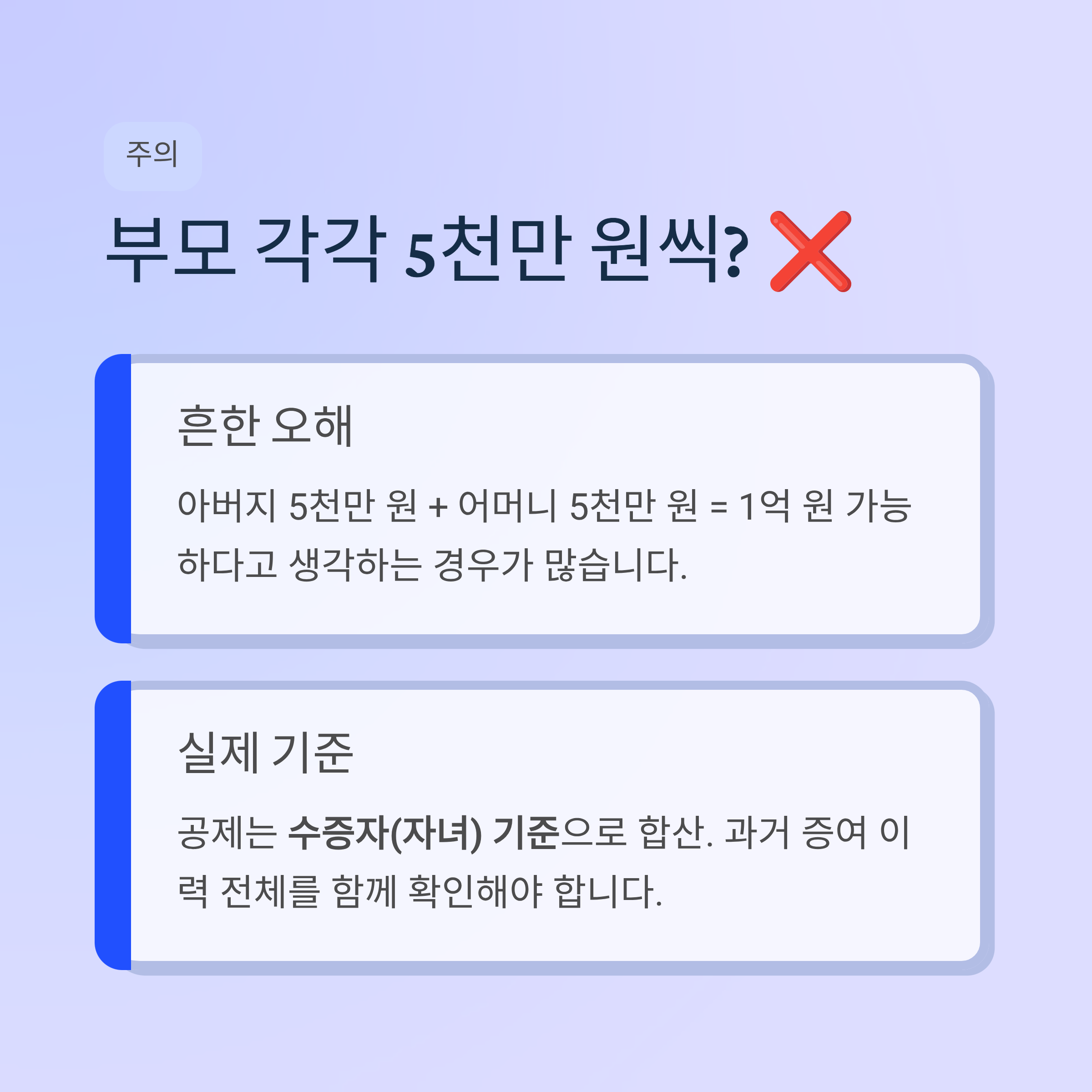 많이 오해하는 부분이 하나 있습니다. 부모 각각 5천만 원씩 따로 가능하다고 생각하는 경우가 많은데, 국세청 설명은 직계존속으로부터 받는 증여를 기준으로 공제 규정을 안내하고 있고, 생활법령정보도 수증자를 기준으로 10년 내 공제받은 금액과 합산한다고 설명합니다. 따라서 실제 증여 설계에서는 과거 증여 이력 전체를 함께 봐야 안전합니다.