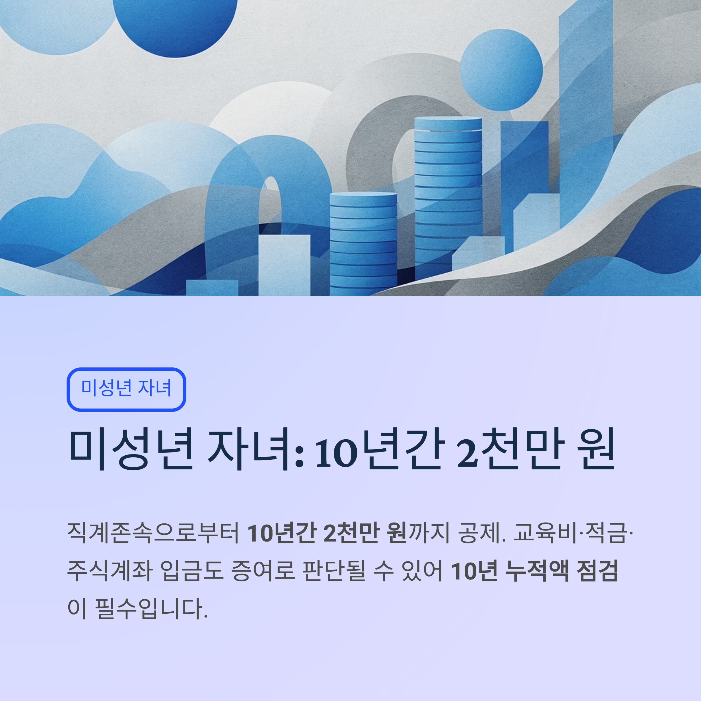 특히 교육비, 적금, 주식계좌 입금처럼 부모가 가볍게 생각한 자금 이동도 실제로는 증여로 판단될 수 있으므로, 미성년 자녀 명의 계좌를 꾸준히 활용하고 있다면 10년 누적액을 먼저 점검하는 것이 좋습니다. 증여세는 한 번의 큰 금액보다, 여러 번 나눠 준 돈이 10년간 누적돼 문제가 되는 경우가 적지 않습니다. 공제 한도 자체가 10년 합산 기준이기 때문입니다.