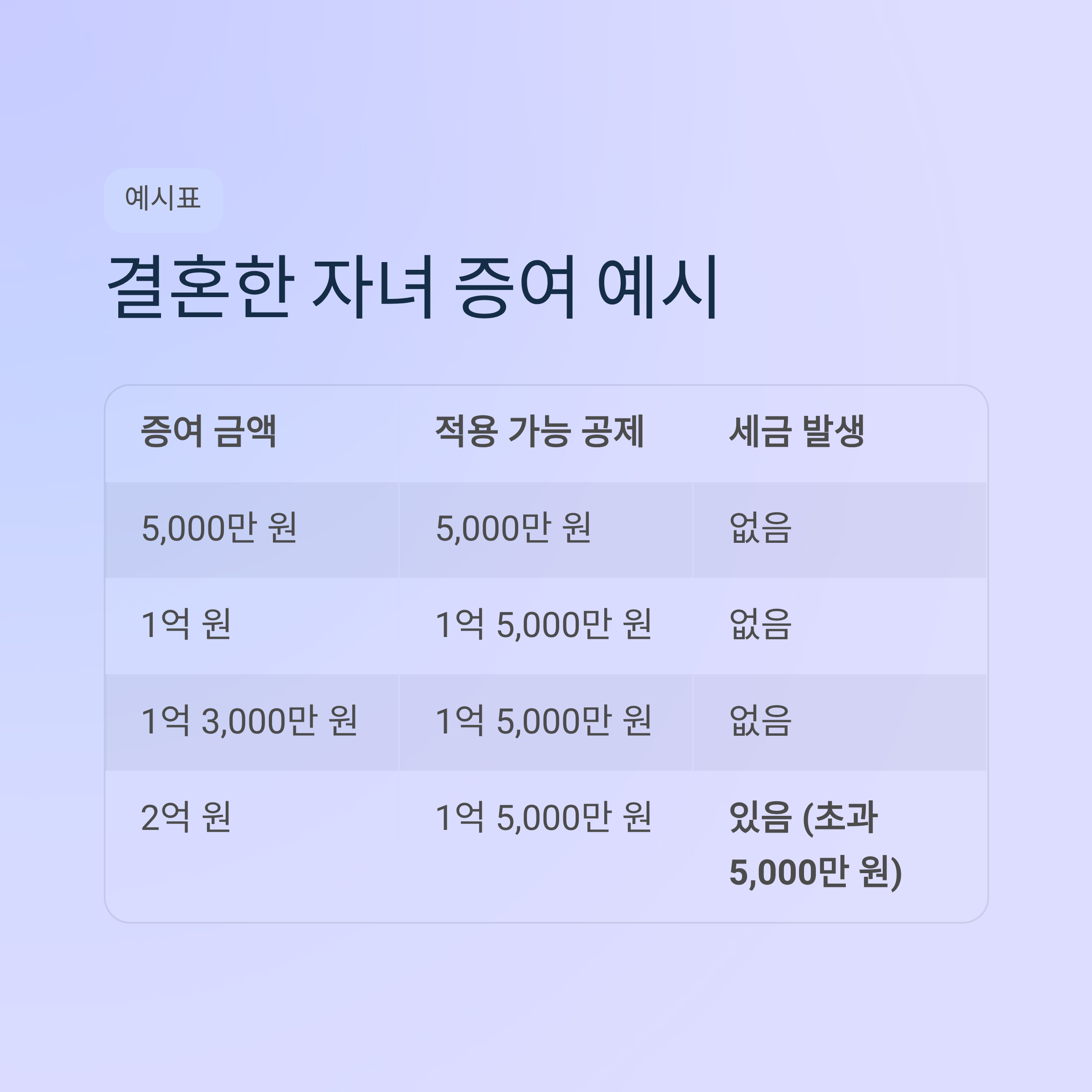 | 증여 금액 | 적용 가능 공제 | 세금 발생 여부 | 설명 |