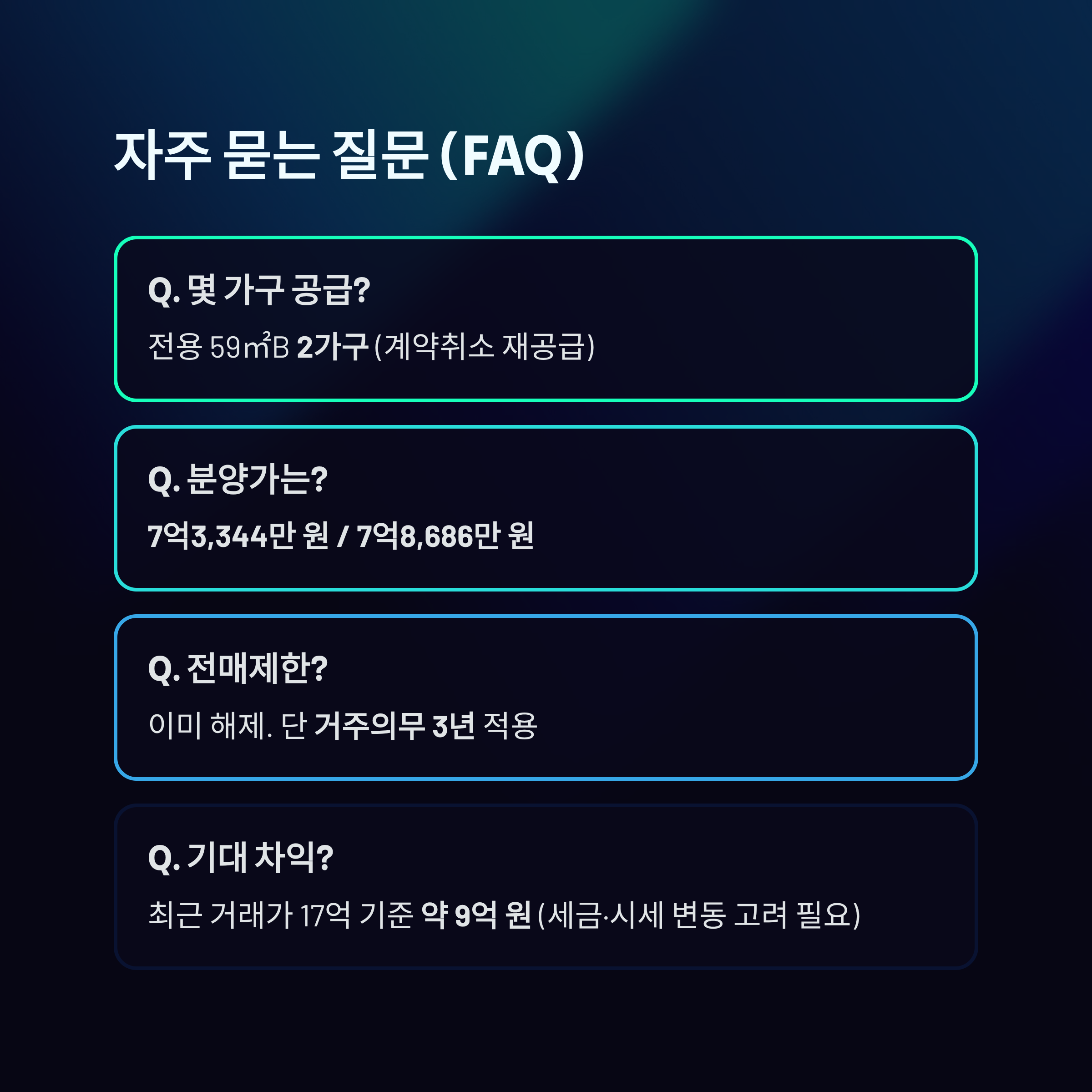 이번 공급 물량은 전용 59㎡B 2가구입니다. 기사 기준으로 공급 층수는 7층과 28층이며, 분양가는 각각 7억3344만 원, 7억8686만 원으로 보도됐습니다. 최고 분양가 기준으로만 보면 7억 후반대입니다.