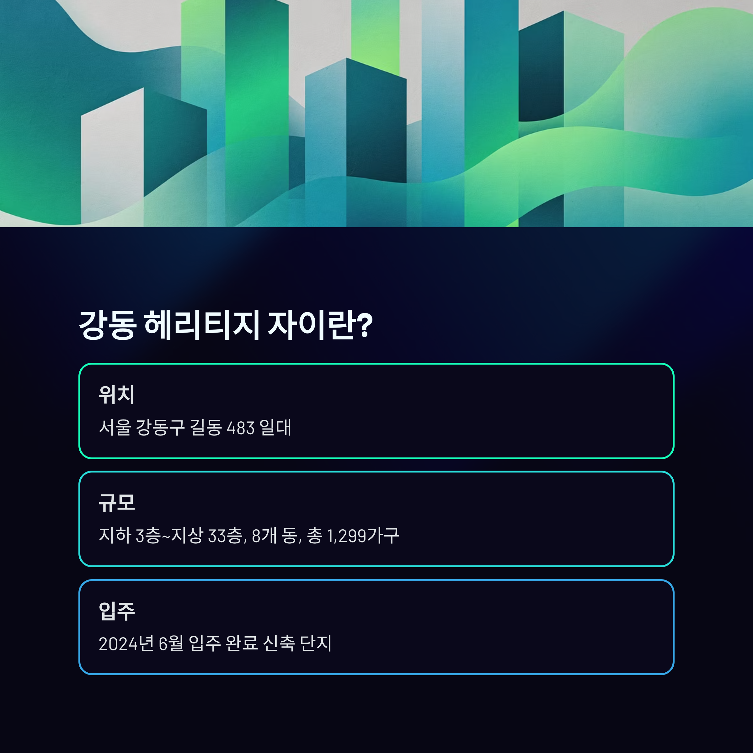 이번 강동 헤리티지 자이 줍줍은 서울 강동구 길동에 있는 강동 헤리티지 자이에서 나온 계약취소분 재공급입니다. 단지 위치는 서울 강동구 길동 483 일대로 확인되며, 단지는 지하 3층~지상 33층, 8개 동, 총 1299가구 규모입니다. 언론 보도에 따르면 이 단지는 2024년 6월부터 입주가 시작된 입주 완료 단지입니다.