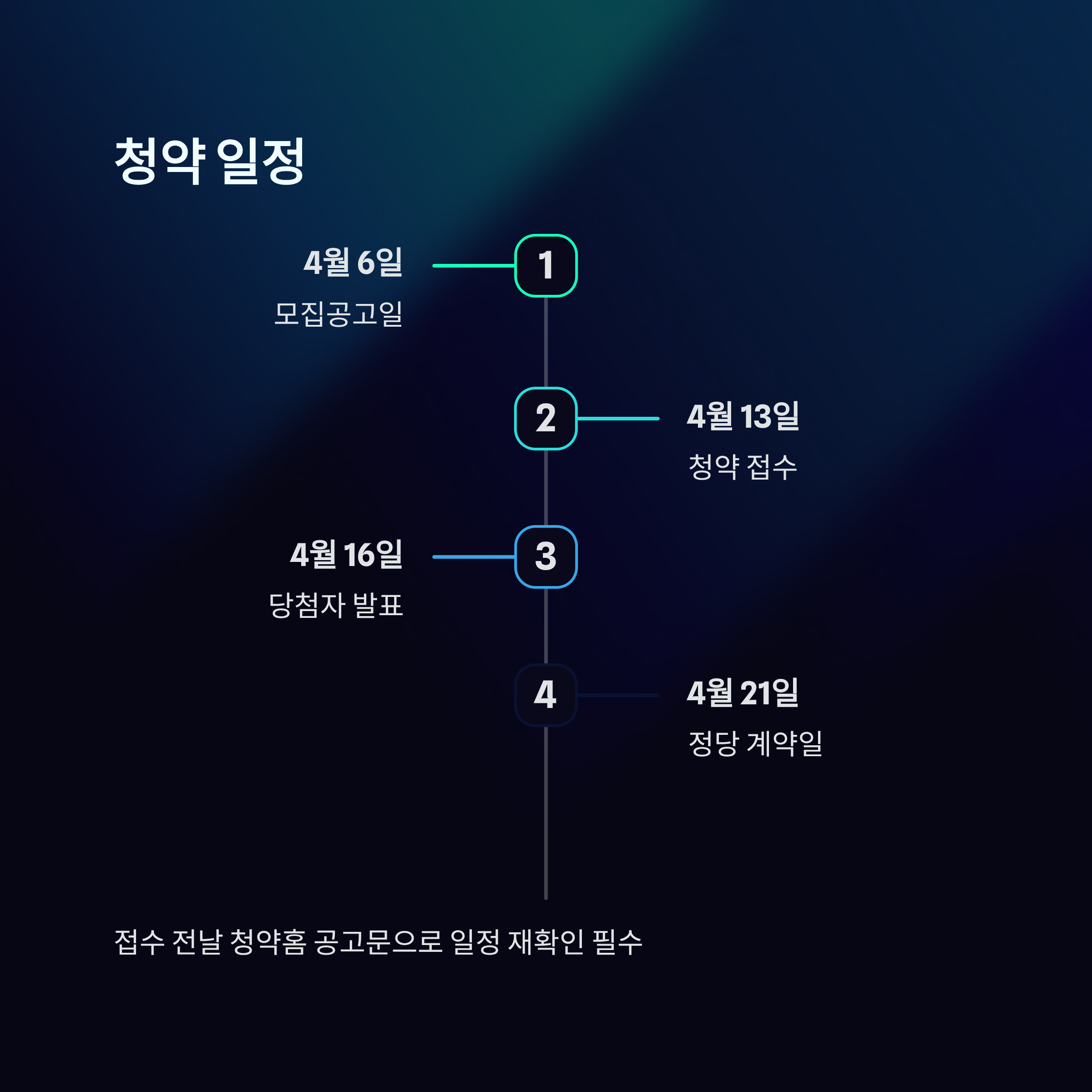 일정은 비교적 명확합니다. 분양 일정 정보에 따르면 모집공고일은 2026년 4월 6일, 일반공급일은 2026년 4월 13일, 당첨자 발표일은 2026년 4월 16일, 정당계약일은 2026년 4월 21일입니다.