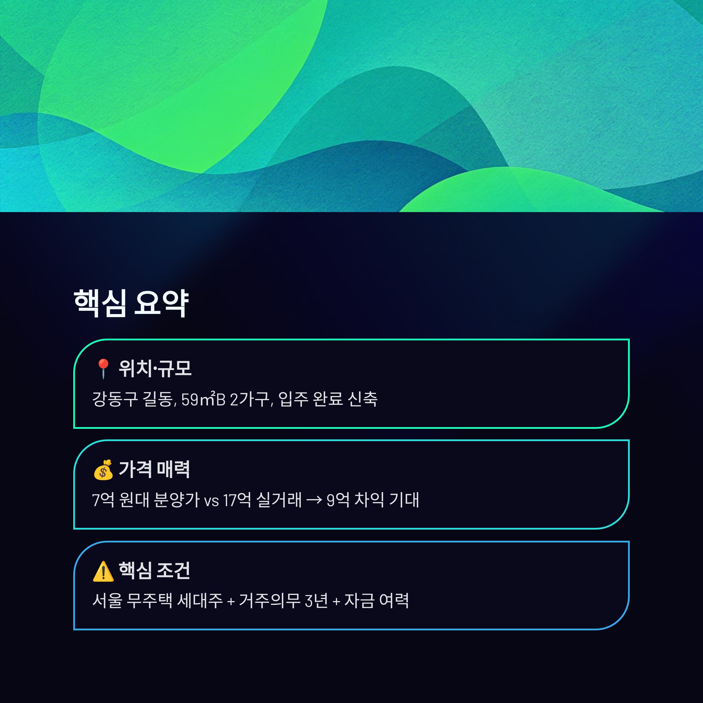 강동 헤리티지 자이 줍줍은 서울 강동구 길동, 전용 59㎡B 2가구, 7억 원대 분양가, 9억 원 안팎 시세차익 기대라는 점에서 2026년 상반기 가장 주목받는 무순위 청약 중 하나로 볼 만합니다. 다만 이 청약은 단순한 로또 접근보다 서울 거주 무주택 세대주 자격, 3년 거주의무, 실입주 자금 계획을 먼저 따져보는 것이 훨씬 중요합니다.