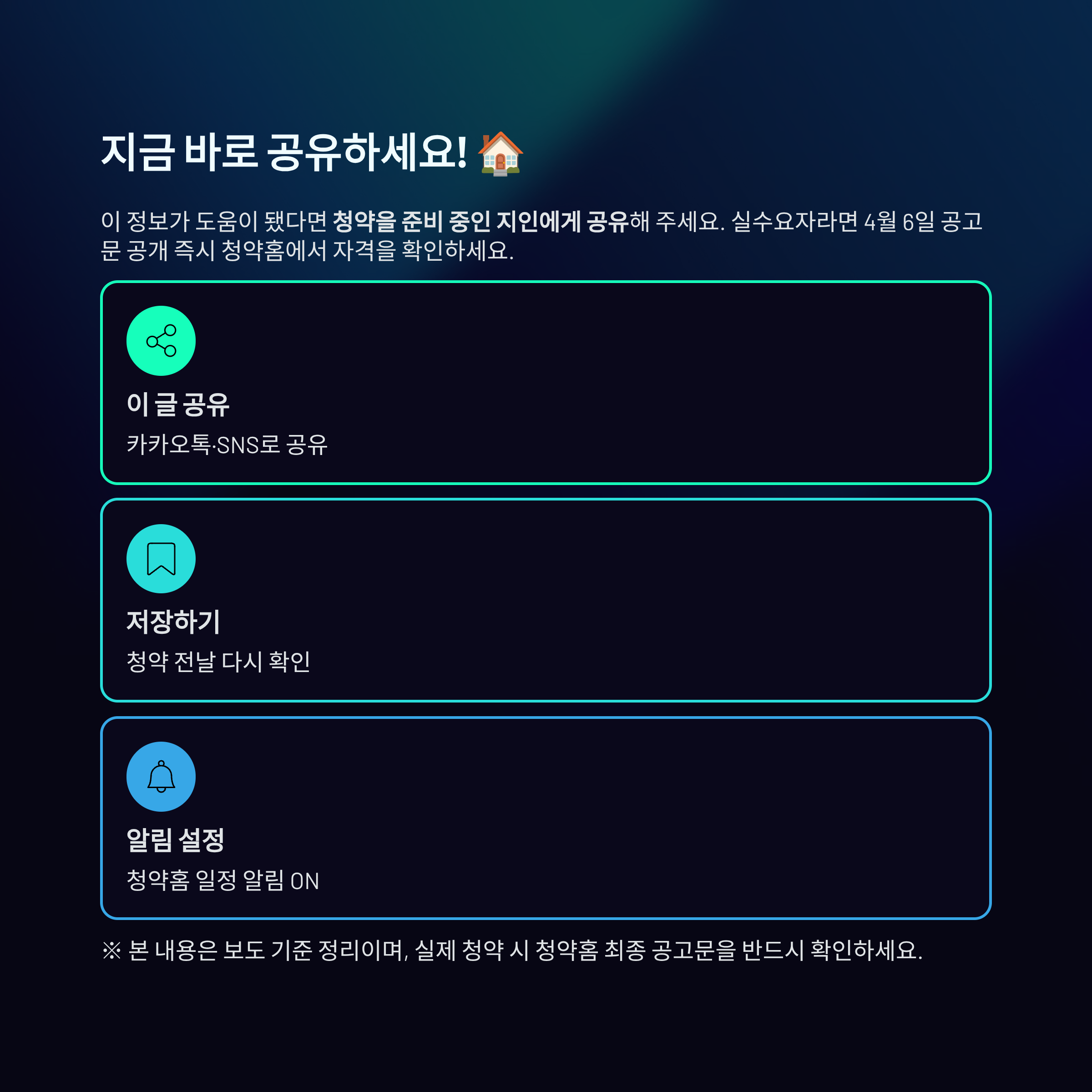 실제 기사에서도 4월 13일 접수, 4월 16일 발표 일정이 재확인되고 있어, 청약하려는 분은 최소한 공고문과 청약홈 일정표를 접수 전날 다시 확인하는 것이 좋습니다. 계약취소분 재공급은 서류와 자격 해석이 일반 청약보다 더 중요할 수 있기 때문입니다.