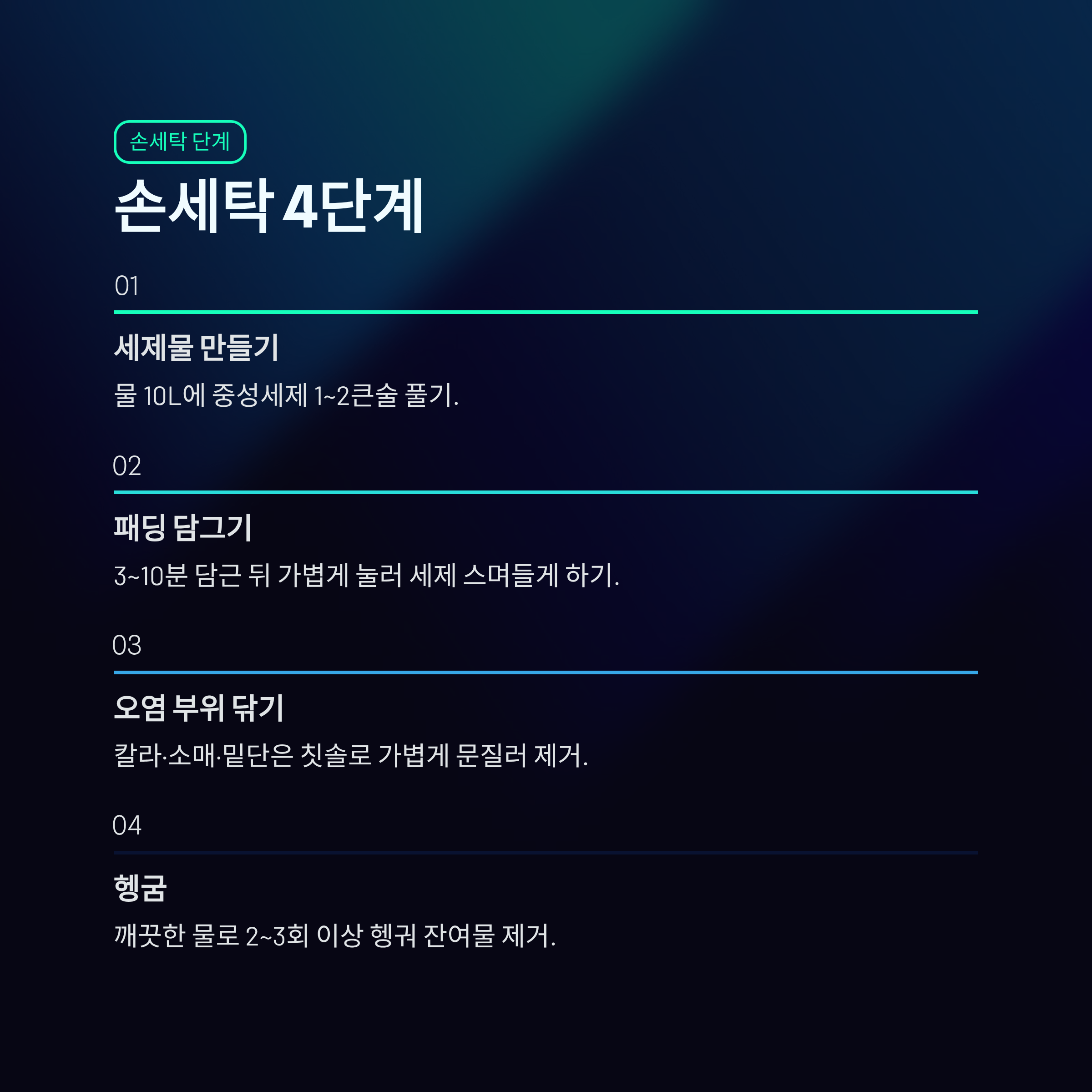 - 물 10L 기준 중성세제 1~2큰술 풀어 충분히 섞기.