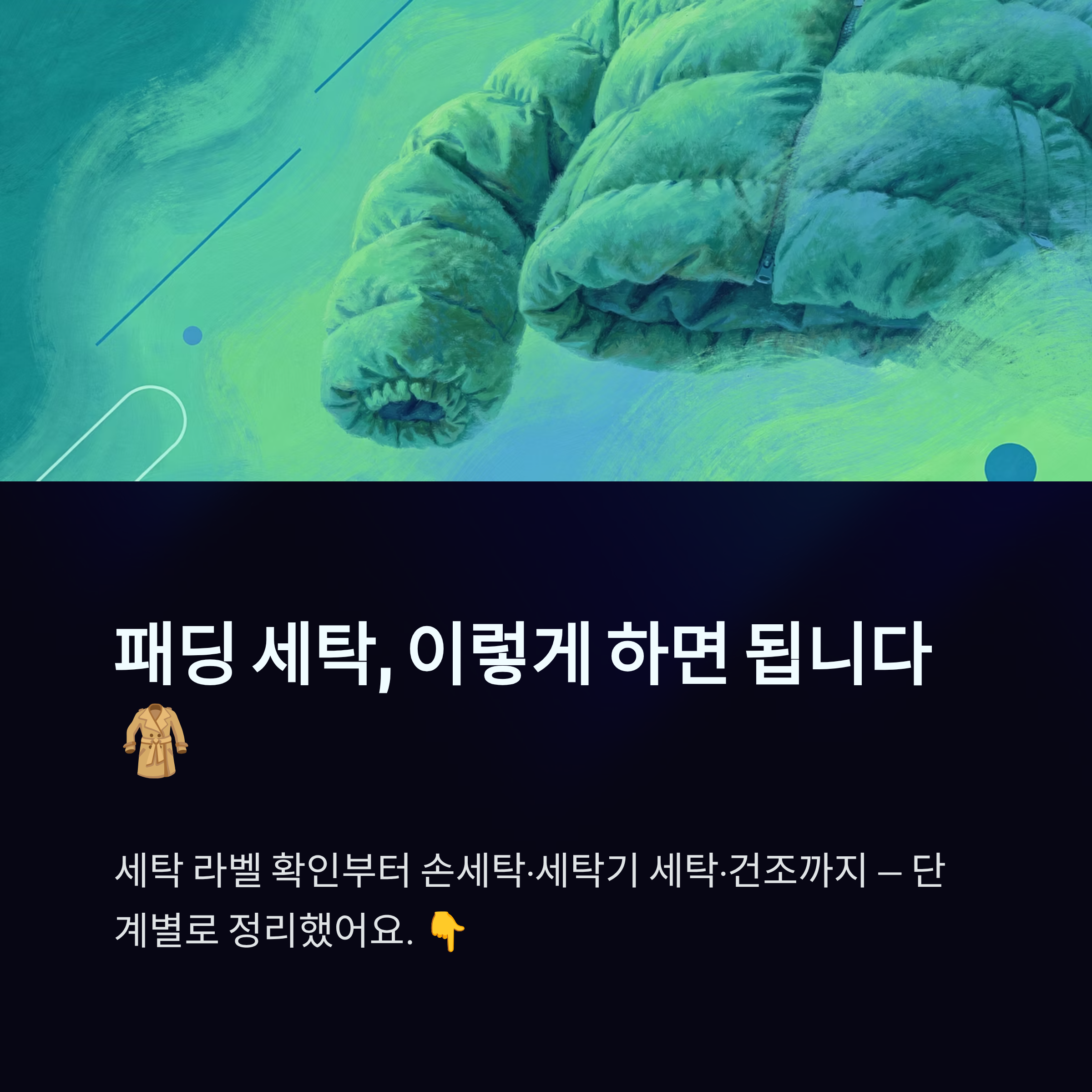 - 뜨거운 물, 표백제, 일반 알칼리세제 사용 금지 → 보온력·원단 손상.