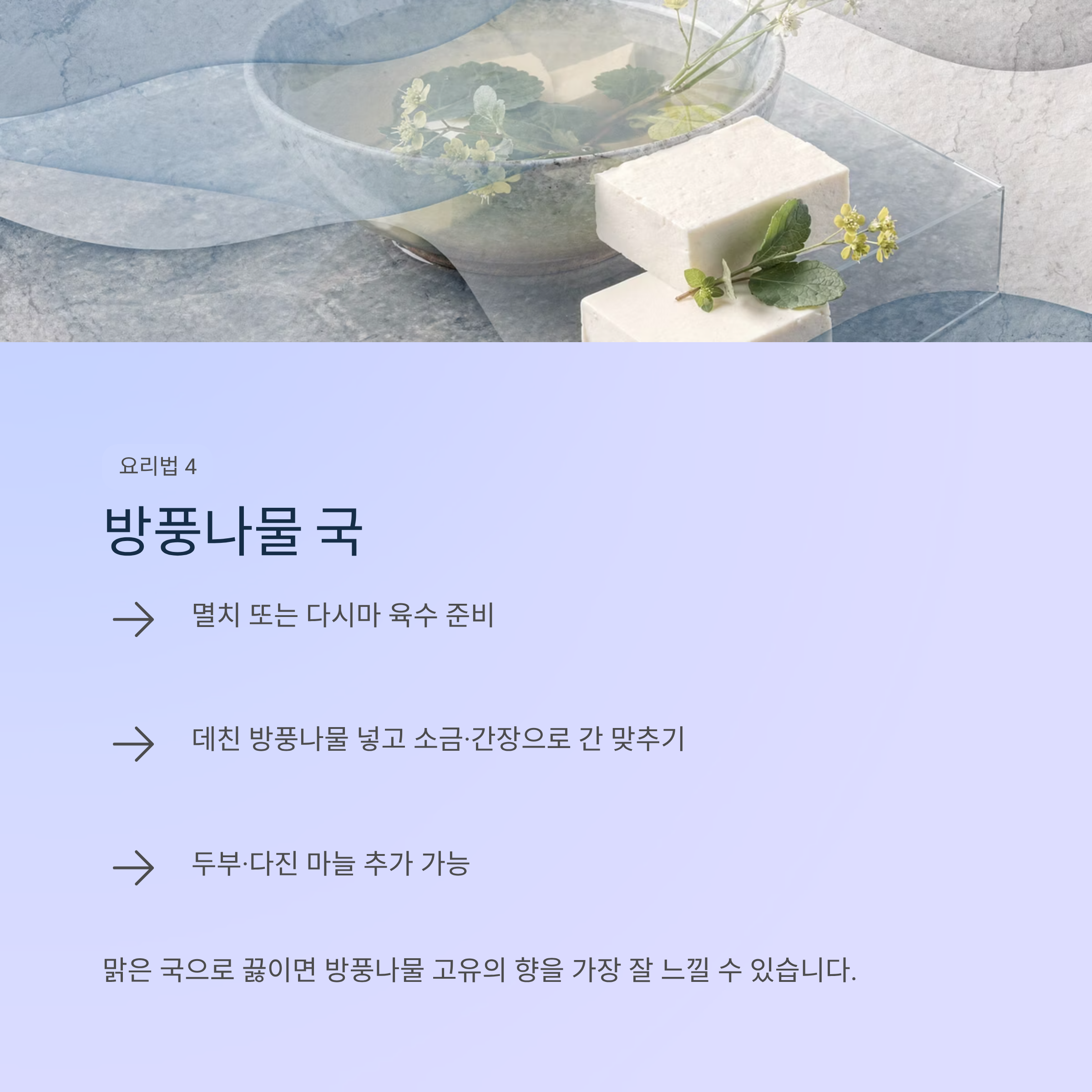 맑은 국처럼 끓이면 방풍나물 고유의 향을 더 잘 느낄 수 있습니다.