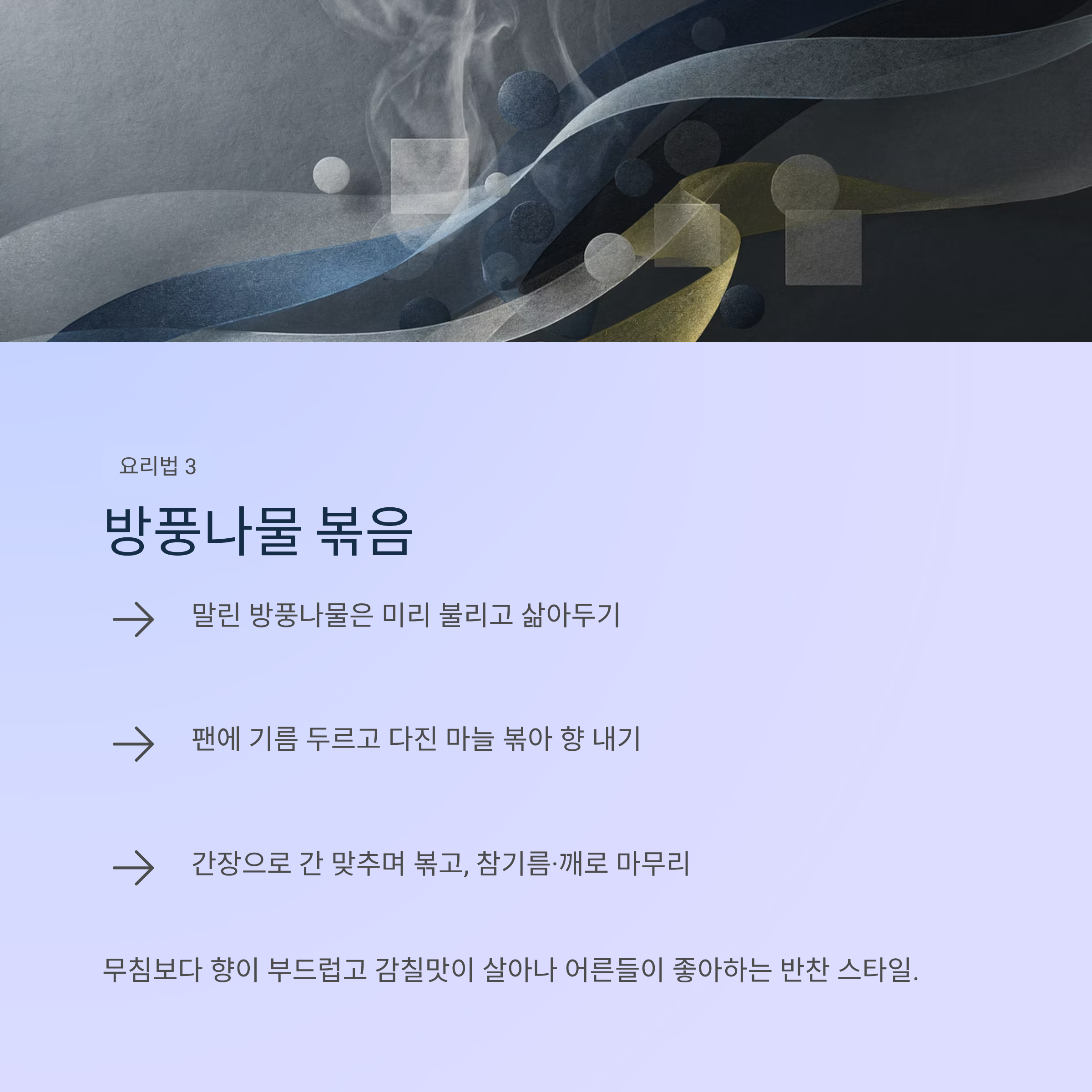 처음 먹는 분은 간장 들기름 무침이 더 깔끔하게 느껴질 수 있고, 진한 밥반찬을 원하면 된장 고추장 무침이 잘 맞습니다.