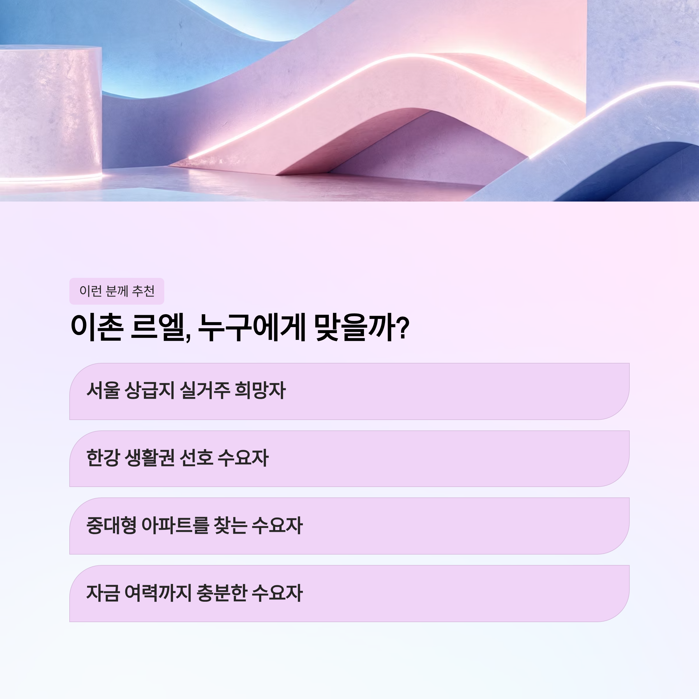 결국 이촌 르엘은 “저렴해서 넣어보는 청약”이 아니라, 상급지 실거주를 목표로 하는 수요층에게 가까운 단지라고 볼 수 있습니다.