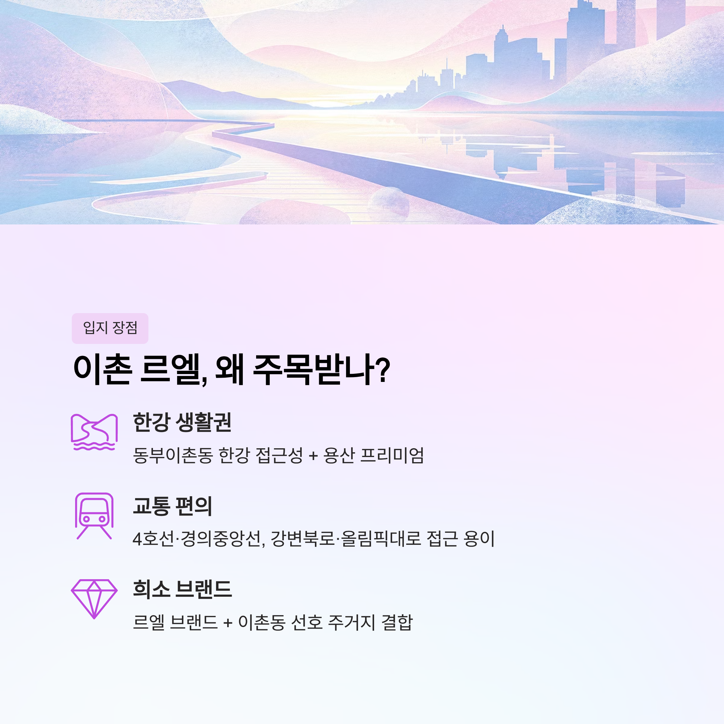 한강 생활권, 용산 프리미엄, 르엘 브랜드, 중대형 위주 일반분양이라는 점에서 높은 관심을 받고 있습니다.
