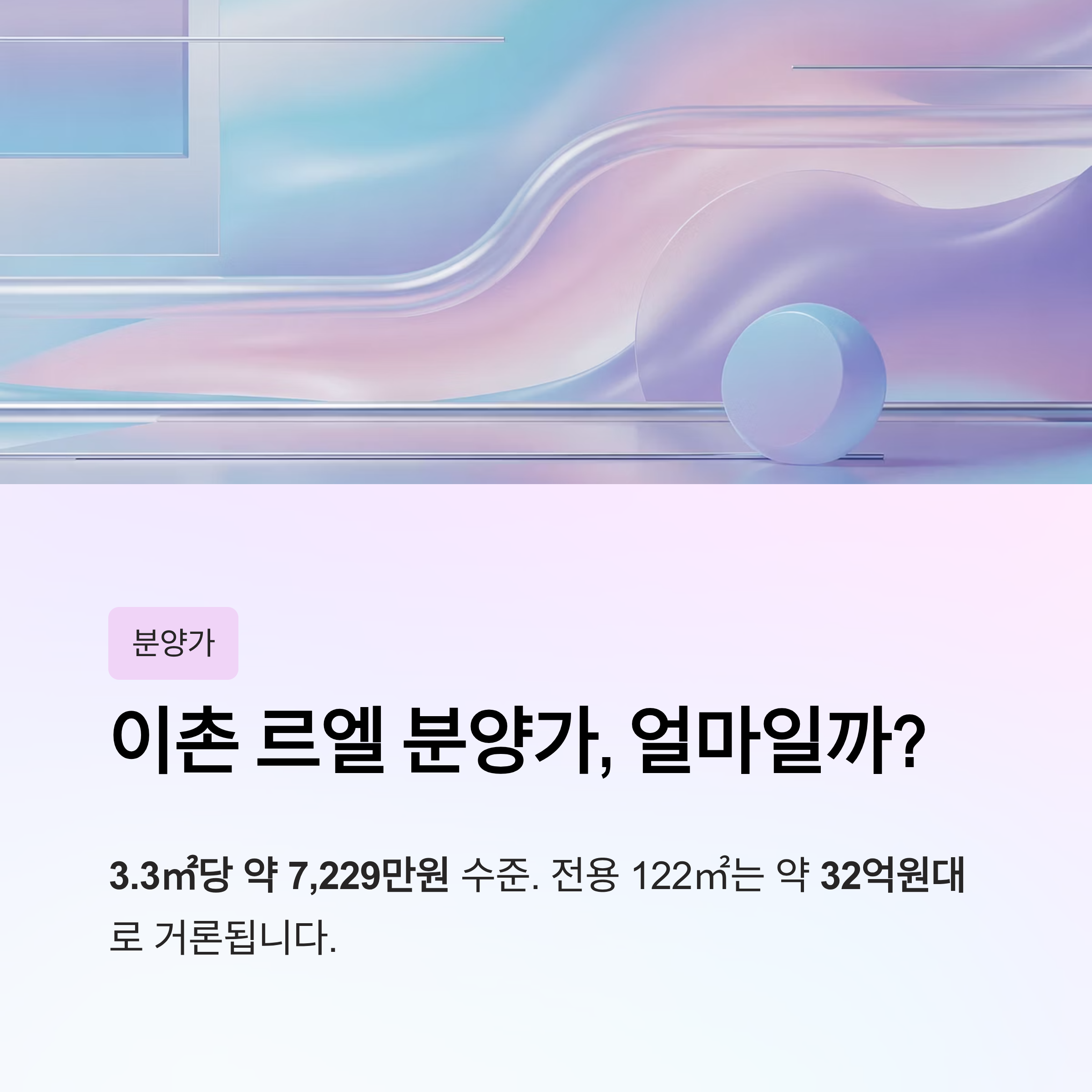 평균적으로 3.3㎡당 7,229만원 수준으로 알려졌으며, 전용 122㎡는 약 32억원대로 거론됩니다.