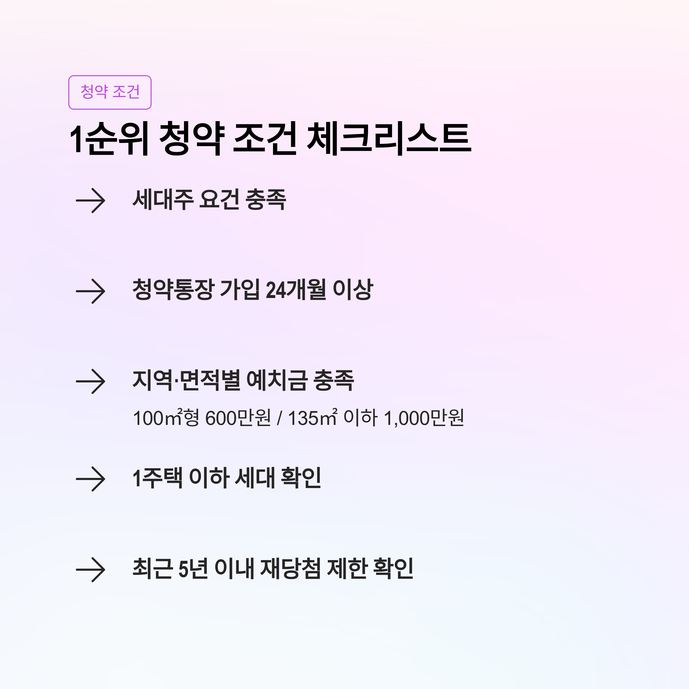세대주 요건, 청약통장 24개월 이상, 지역·면적별 예치금 충족, 1주택 이하 여부, 재당첨 제한 여부 등을 확인해야 합니다.