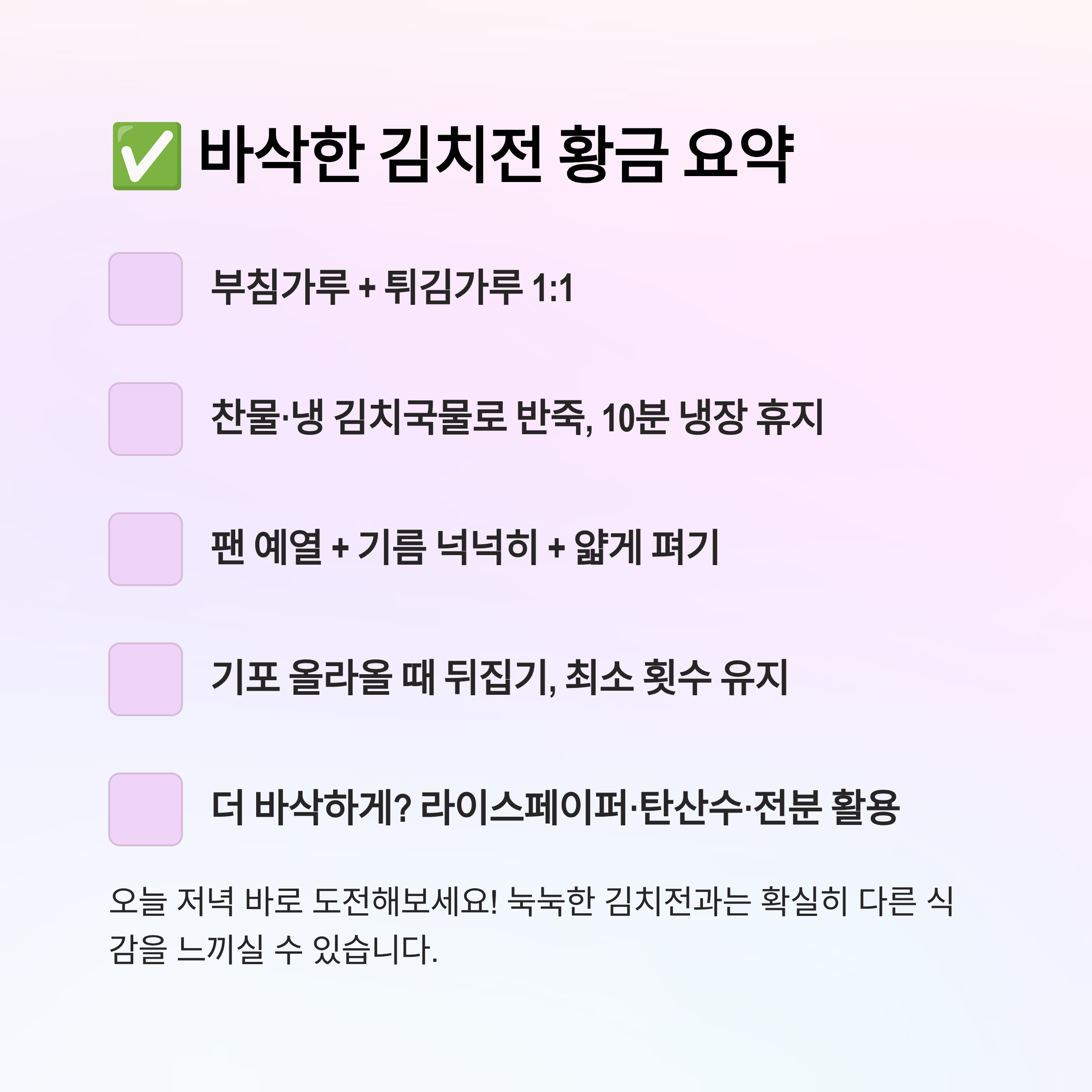 김치전 바삭하게 만드는 방법은 어렵지 않습니다. 핵심은 부침가루와 튀김가루 1:1 비율, 찬물 반죽, 넉넉한 기름, 얇게 부치기입니다. 여기에 라이스페이퍼나 탄산수 같은 추가 팁까지 더하면 집에서도 전집 못지않은 바삭한 김치전을 만들 수 있습니다.
