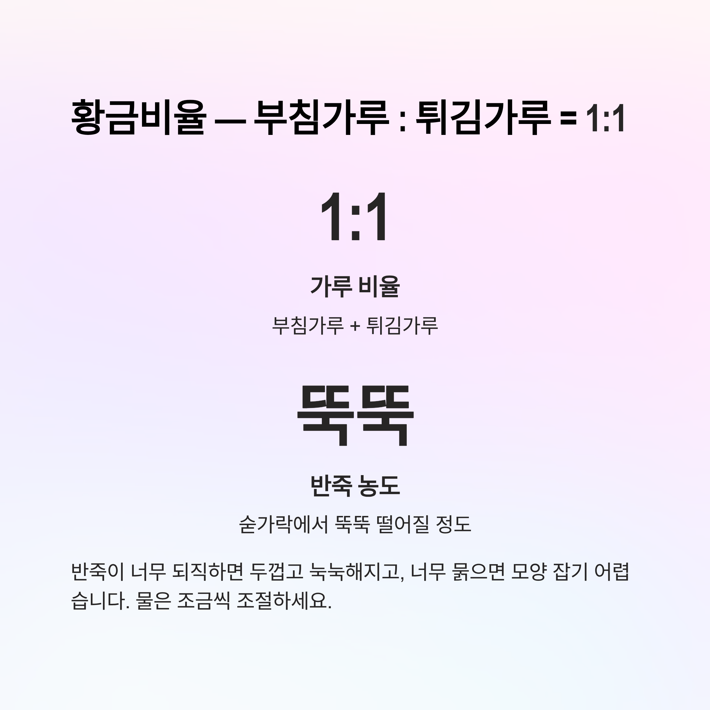 첫째, 부침가루와 튀김가루를 1:1 비율로 섞는 것입니다.