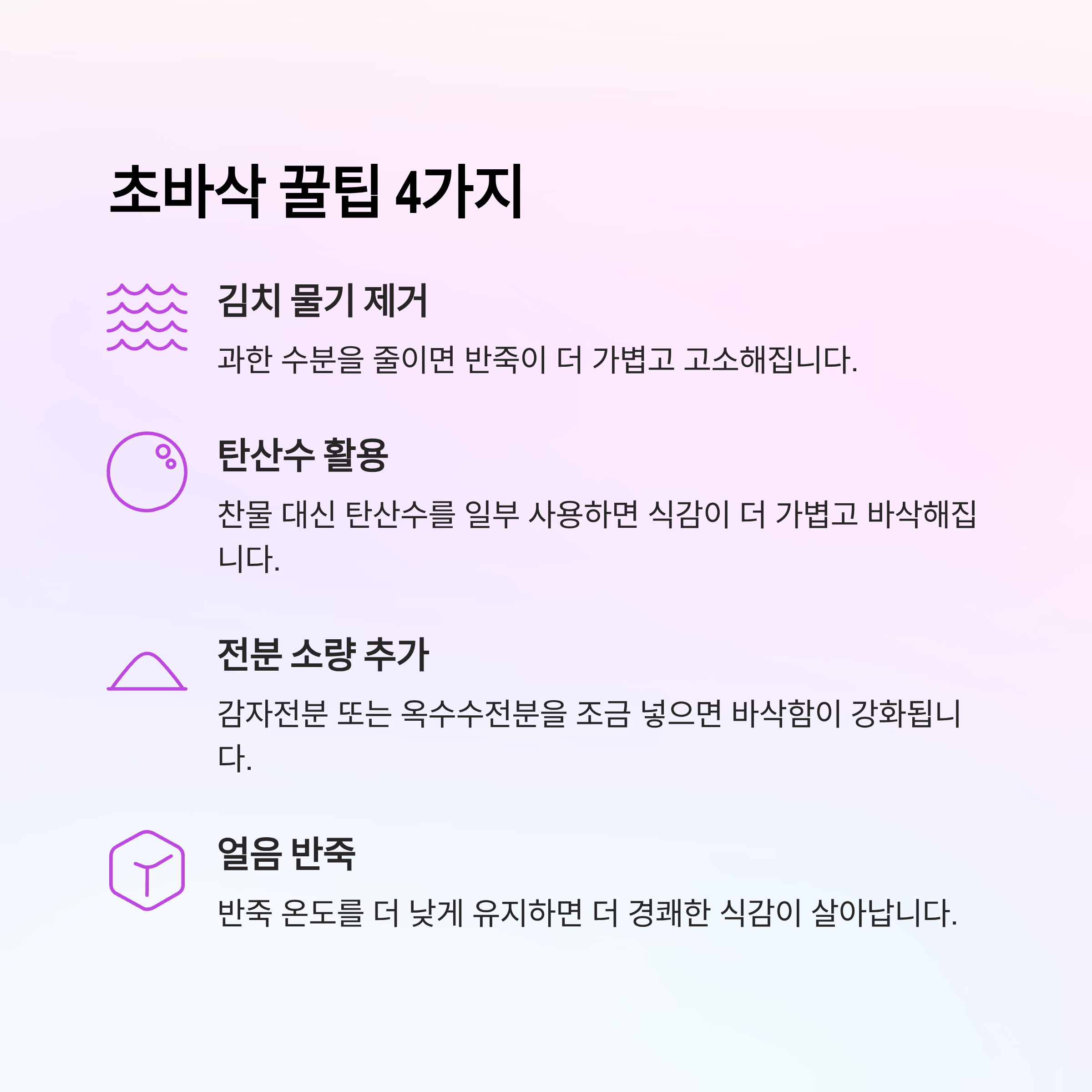 기본 레시피만으로도 충분히 바삭하지만, 더 강한 식감을 원한다면 아래 방법도 좋습니다.
