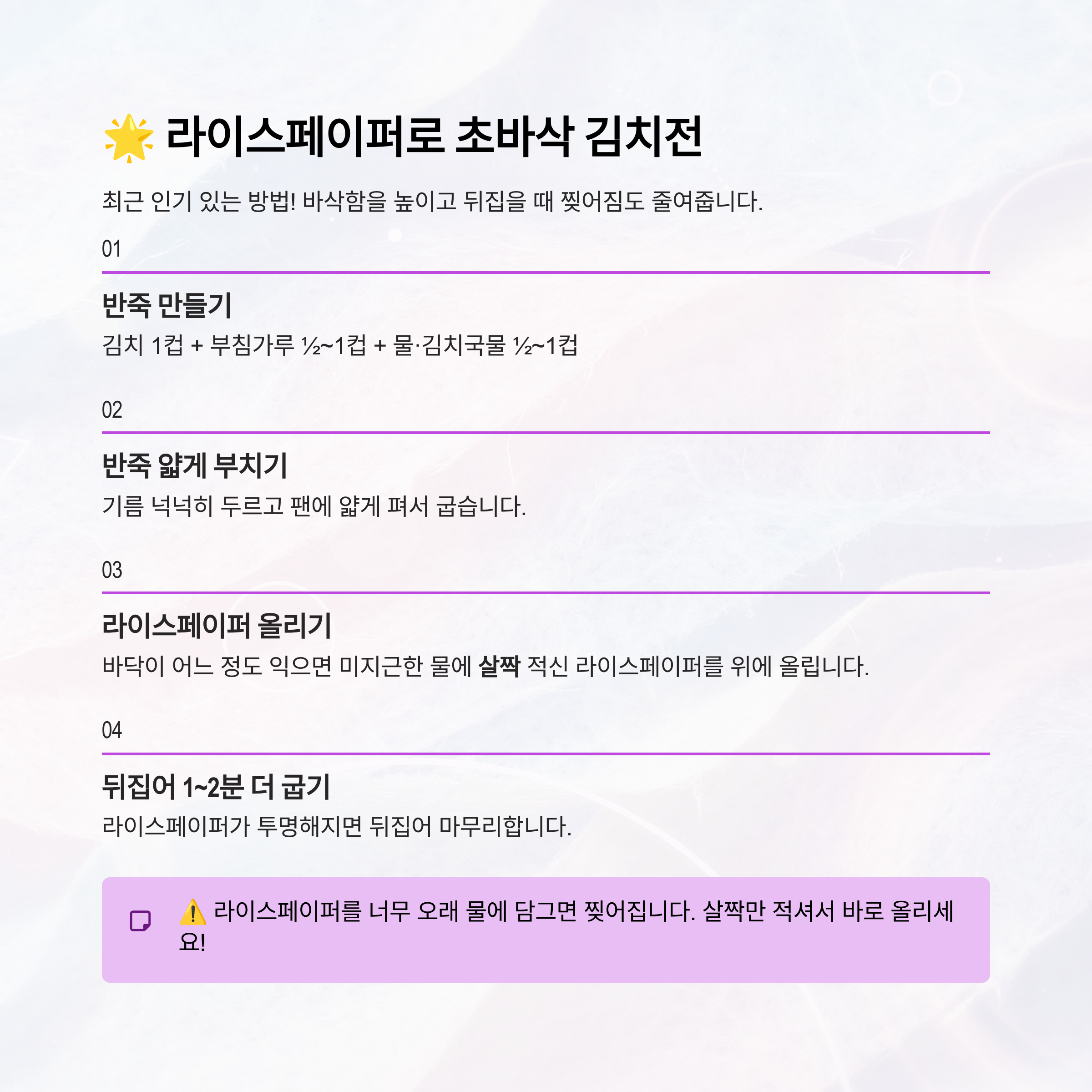 최근에는 라이스페이퍼를 활용해 김치전을 더 바삭하게 만드는 방법도 많이 찾습니다. 이 방법은 바삭함을 높이는 것은 물론, 뒤집을 때 찢어짐을 줄이는 데도 도움이 됩니다.