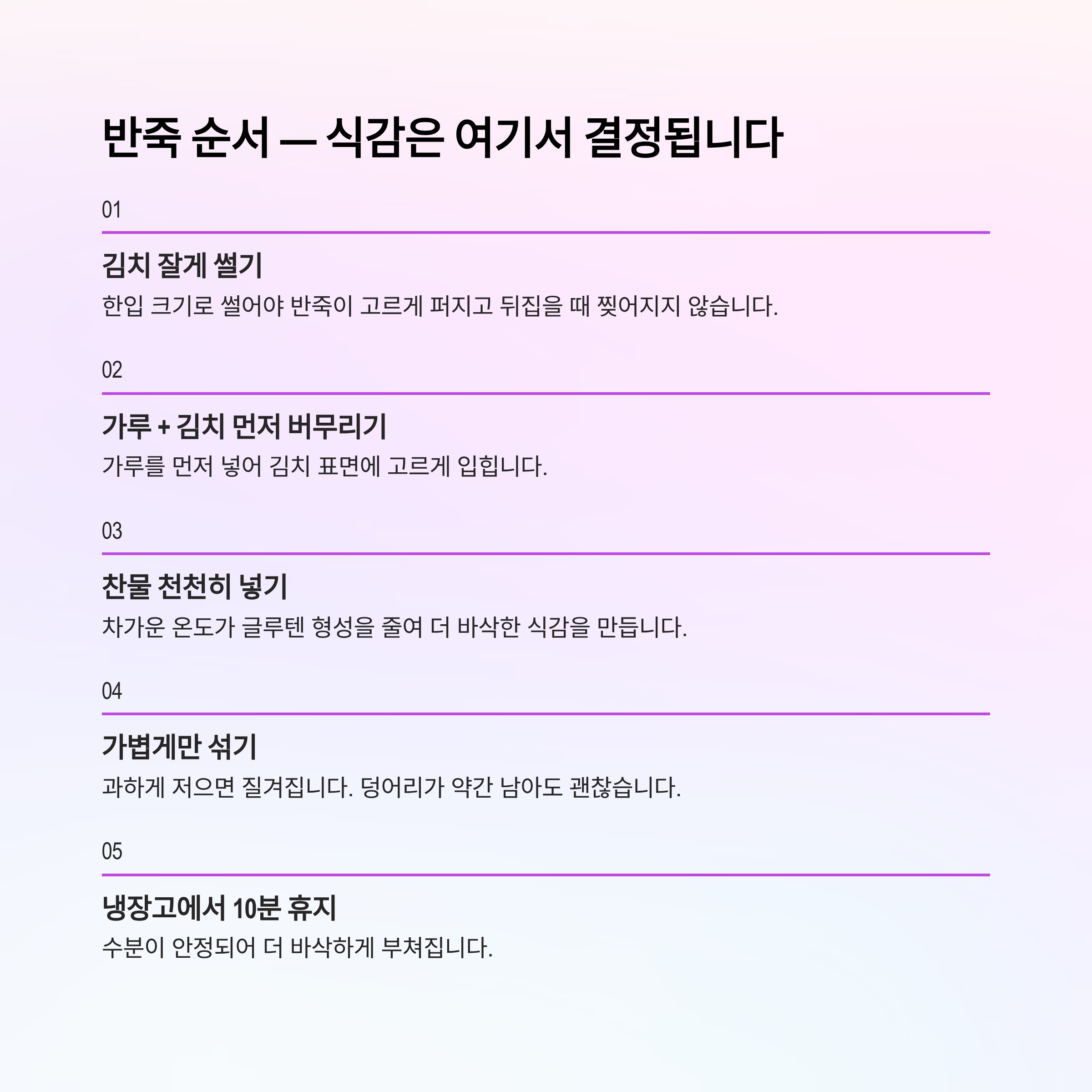 김치전은 반죽 단계에서 이미 식감이 결정됩니다. 아래 순서를 지켜보세요.