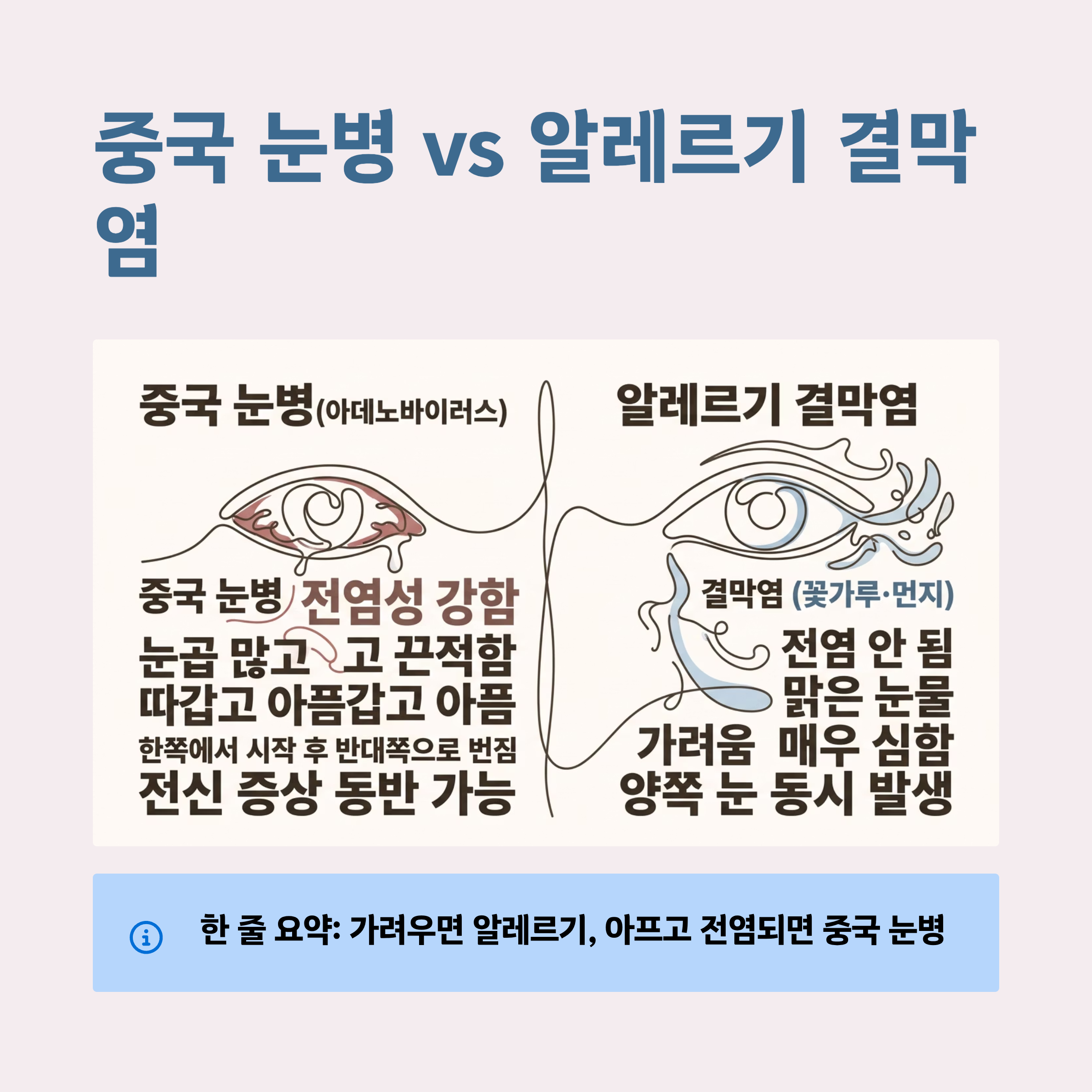 한 줄로 정리하면, 가려움이 심하면 알레르기 결막염 가능성이 높고, 아프고 전염되면 중국 눈병 가능성이 높다고 볼 수 있습니다.