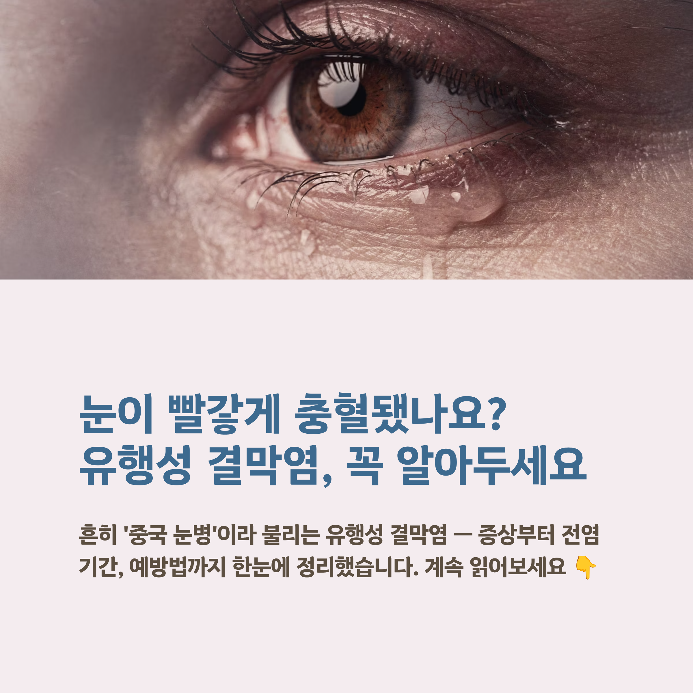 눈이 심하게 아프거나 시야가 흐려지고, 증상이 오래 가거나 악화된다면 집에서 버티기보다 안과 진료를 받는 것이 좋습니다. 초기에 잘 관리하면 주변 전염도 줄이고 회복도 더 편해질 수 있습니다.