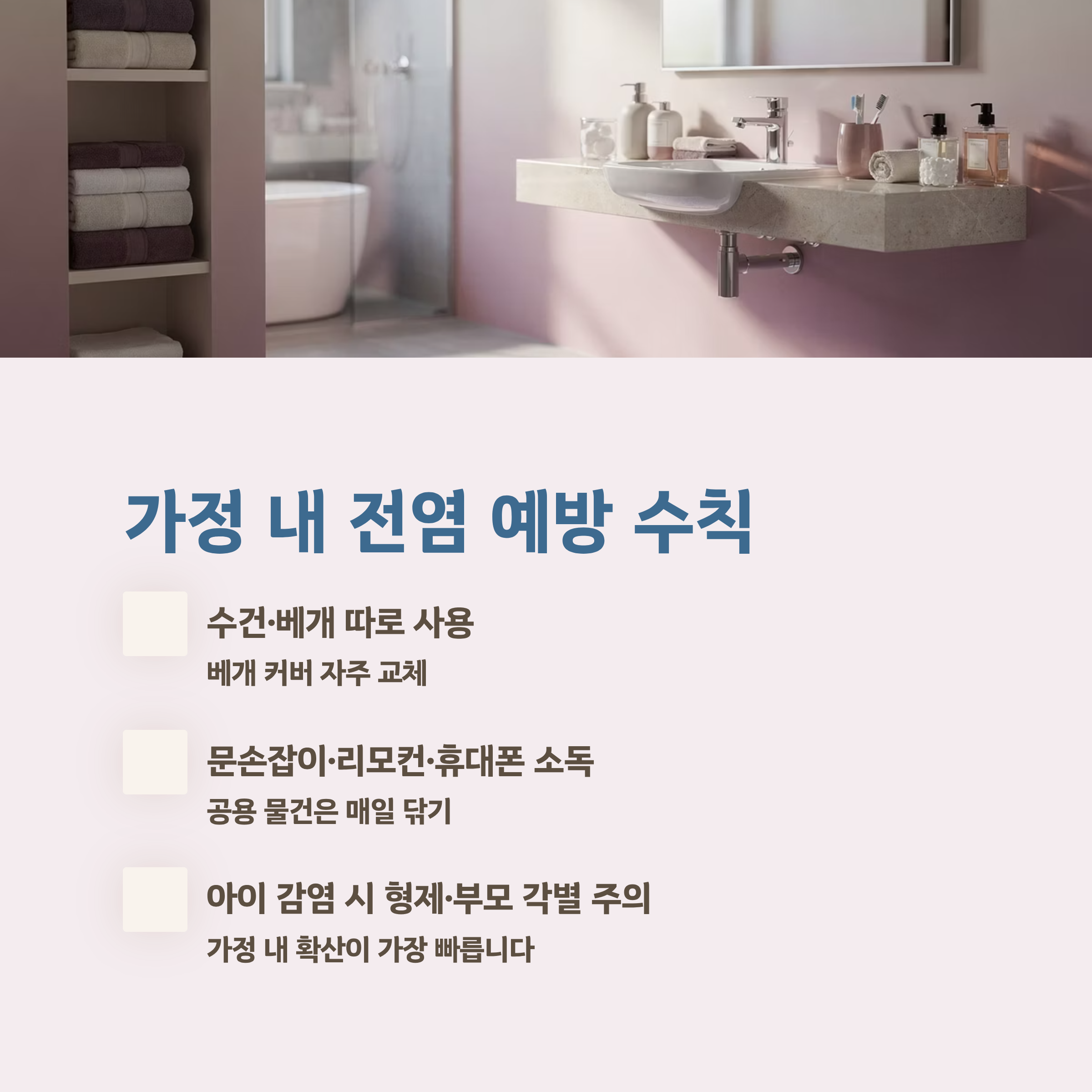 특히 아이가 감염되면 형제자매나 부모에게 옮기기 쉬우므로 가정 내 관리가 매우 중요합니다.