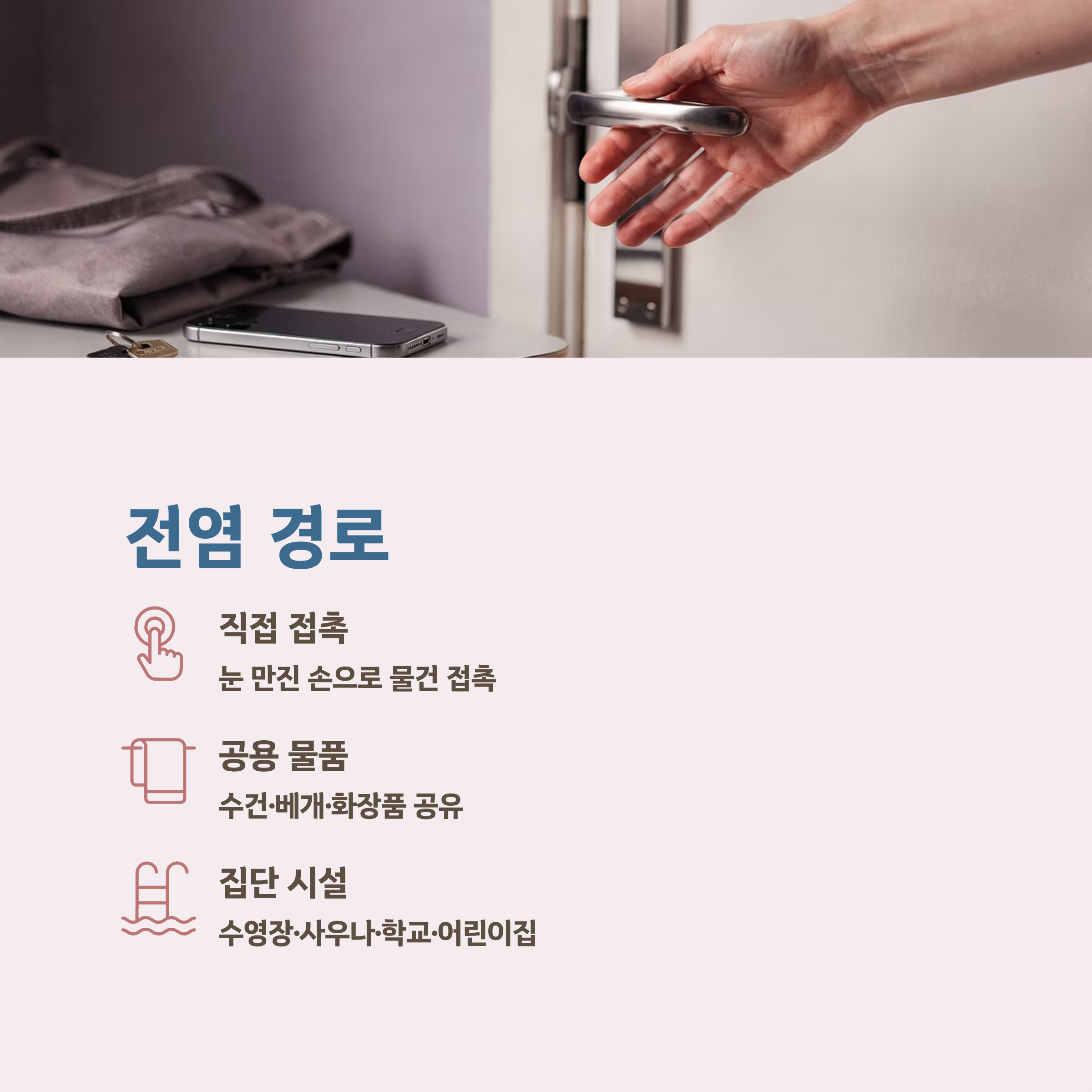 - 문손잡이, 휴대폰, 책상 등 공용 물건 접촉