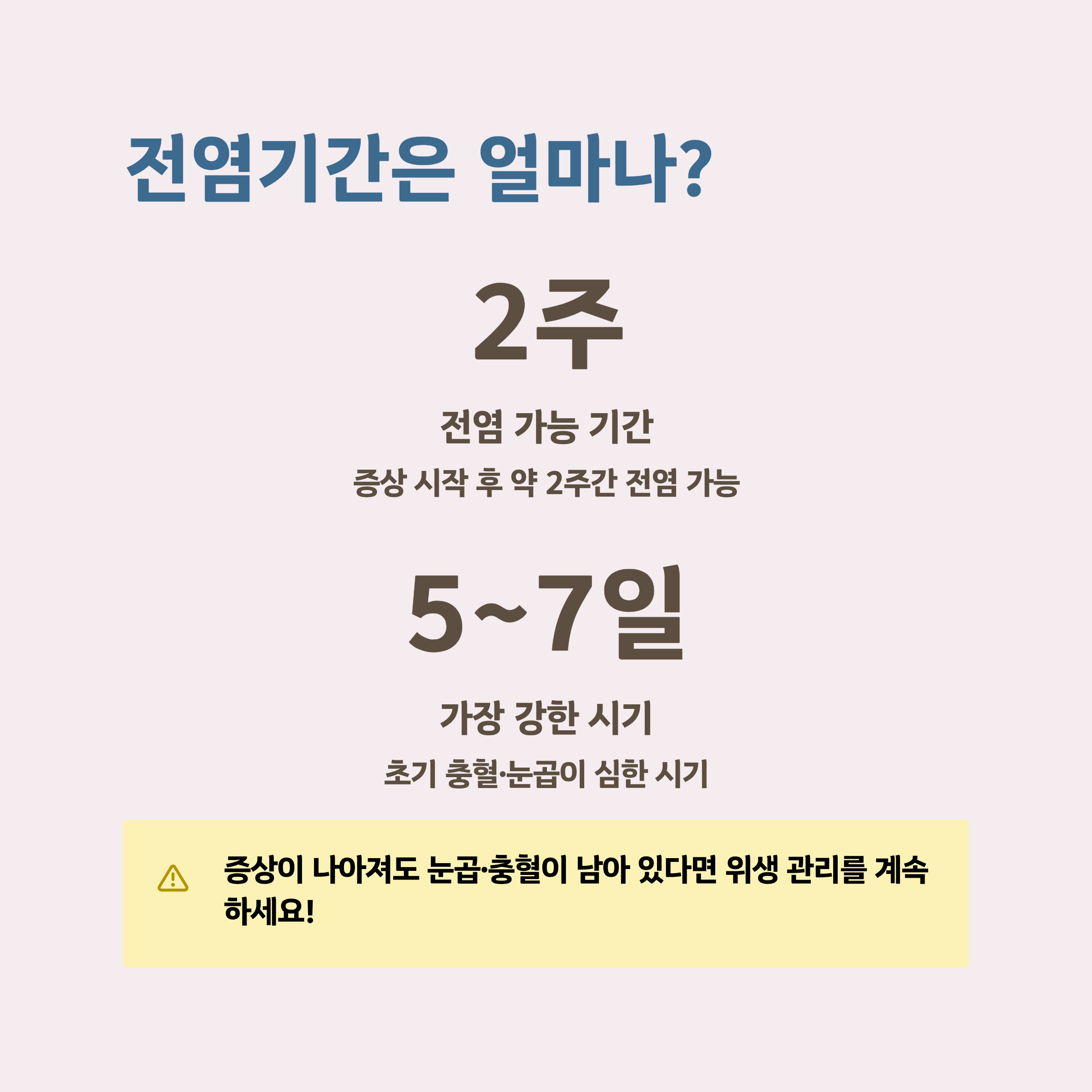 증상 시작 후 약 2주간 전염 가능성이 있으며, 특히 초기 5~7일이 가장 전염력이 강합니다.