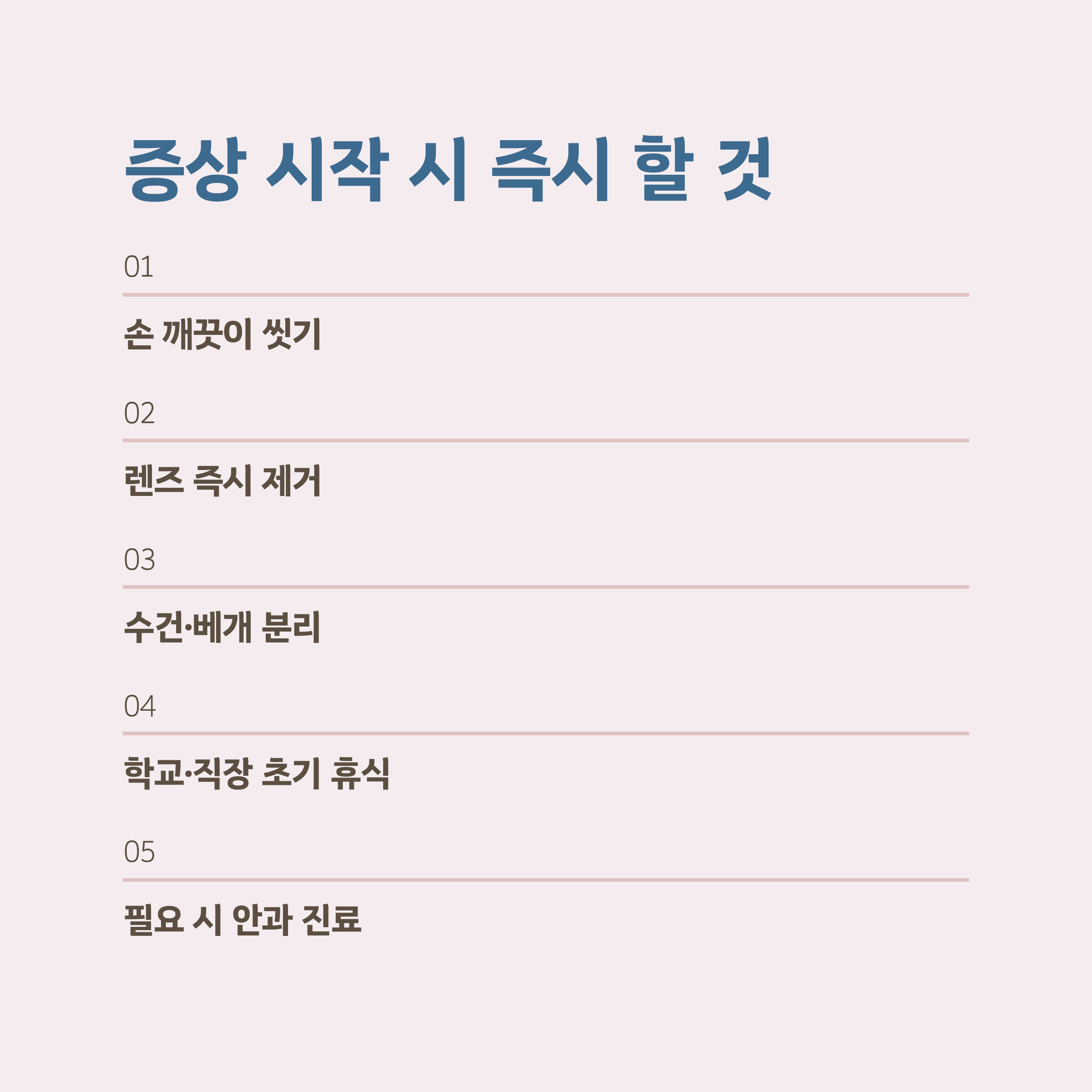 - 눈을 비비지 않고 자극 최소화