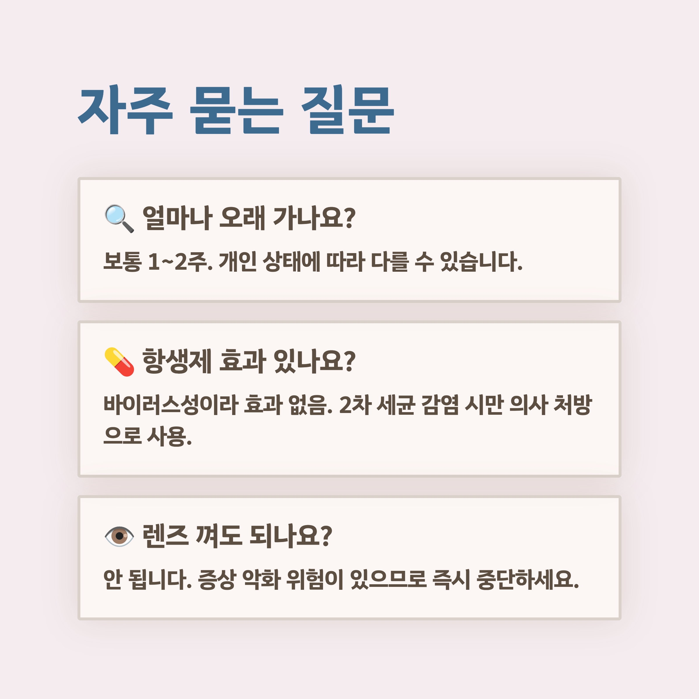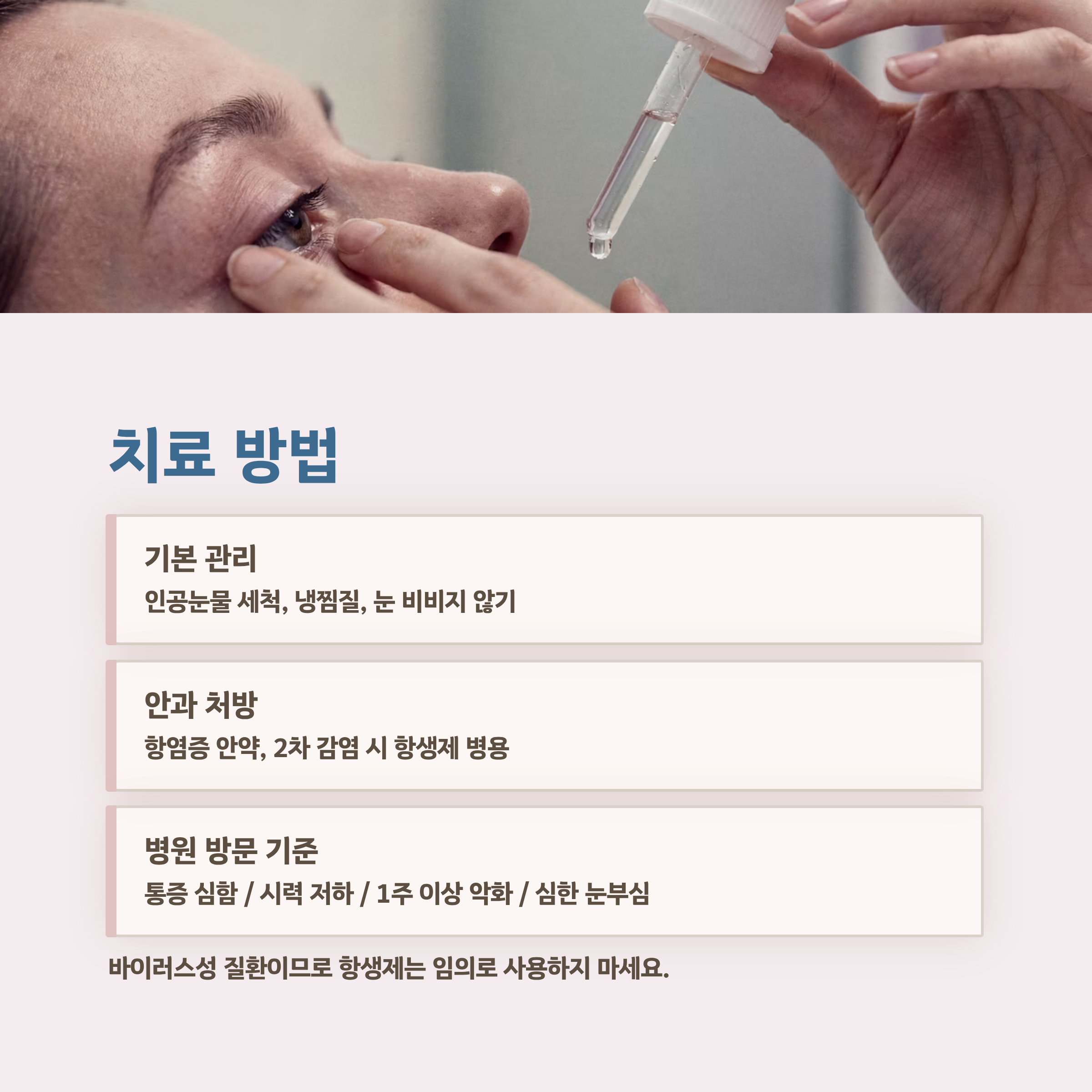 - 필요 시 안과 진료 후 안약 처방