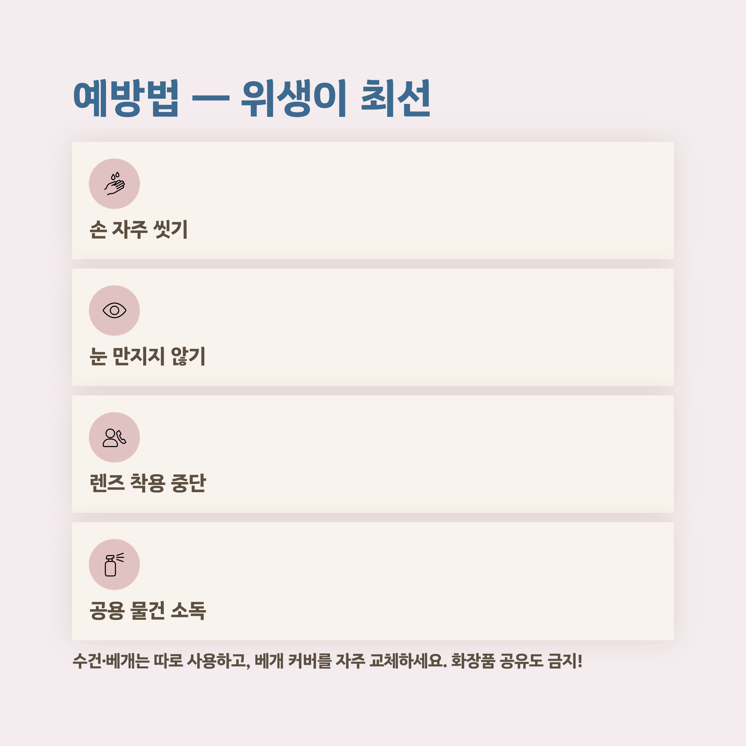 중국 눈병은 치료보다 예방이 훨씬 중요합니다. 전염성이 강하기 때문에 감염 후 확산을 막는 생활수칙을 철저히 지켜야 합니다.
