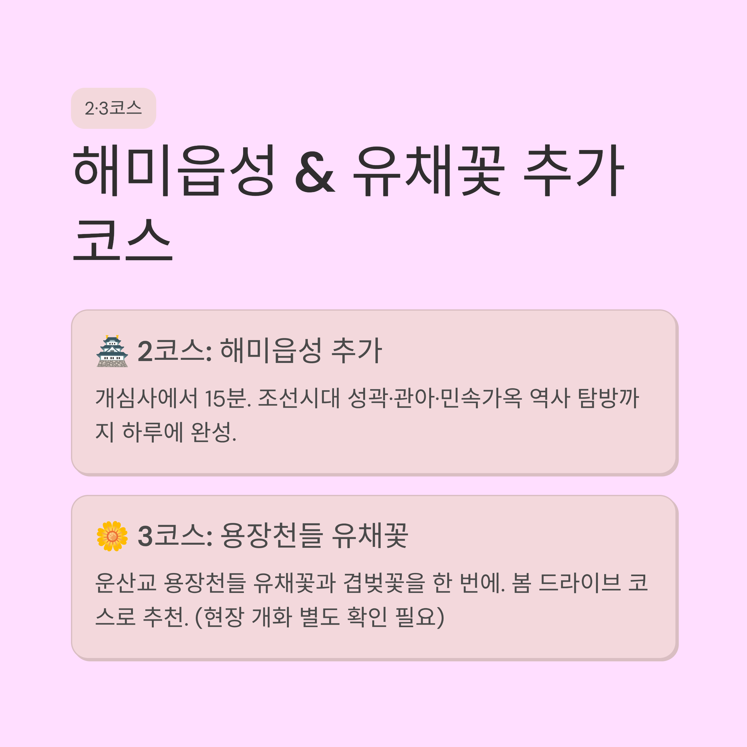 연계코스로는 개심사, 해미읍성, 상황에 따라 용장천들 유채꽃까지 묶으면 봄 서산 여행 코스로 완성도가 높습니다.