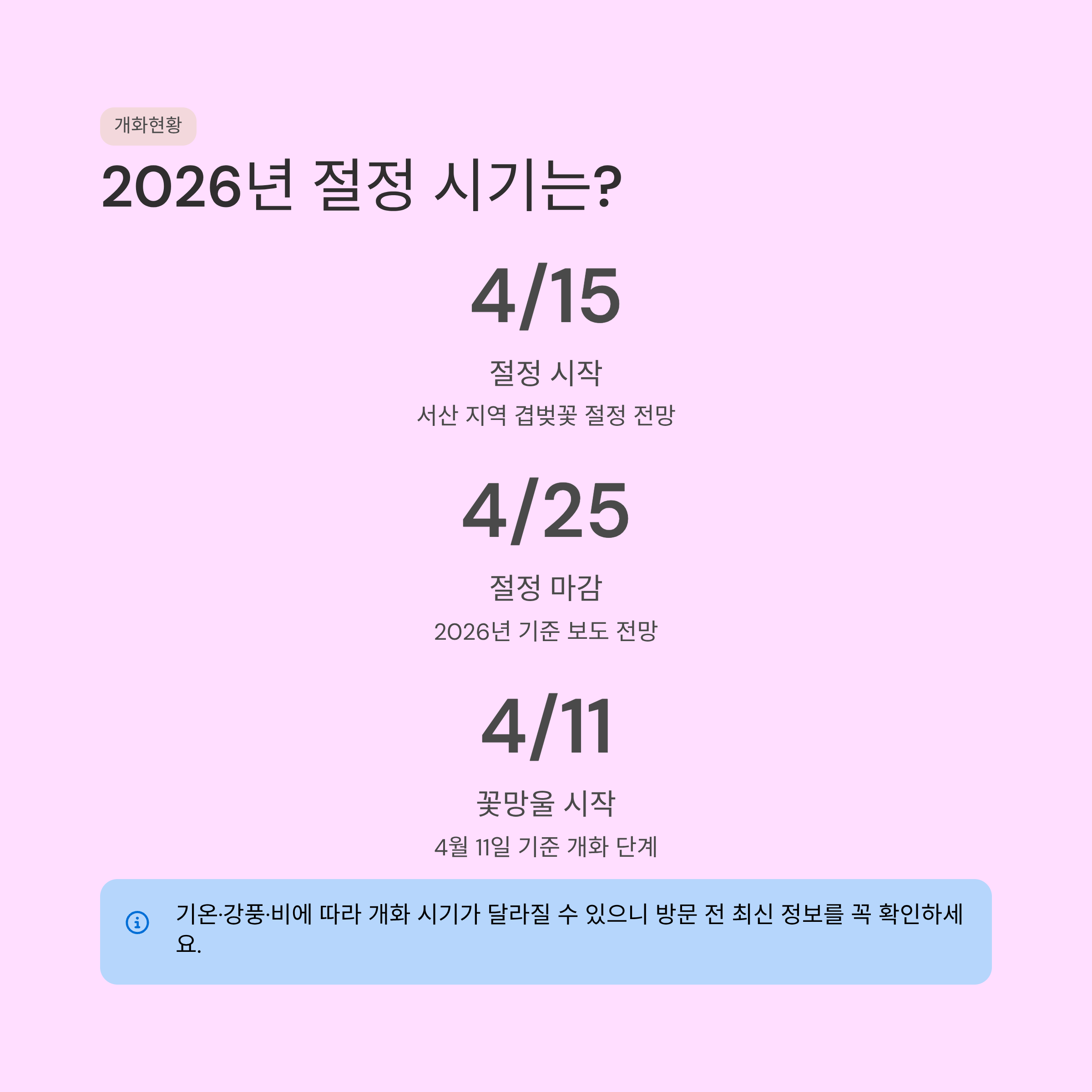 겹벚꽃은 일반 벚꽃보다 보통 2주 정도 늦게 피는 편입니다. 최근 기사에서는 문수사의 절정 시기를 대체로 4월 중순~말로 설명하고 있고, 2026년 서산 지역 겹벚꽃은 4월 15일~25일 사이 절정 전망으로 보도됐습니다. 또 4월 11일 기준 문수사는 꽃망울이 막 올라오는 단계라고 전해졌습니다.