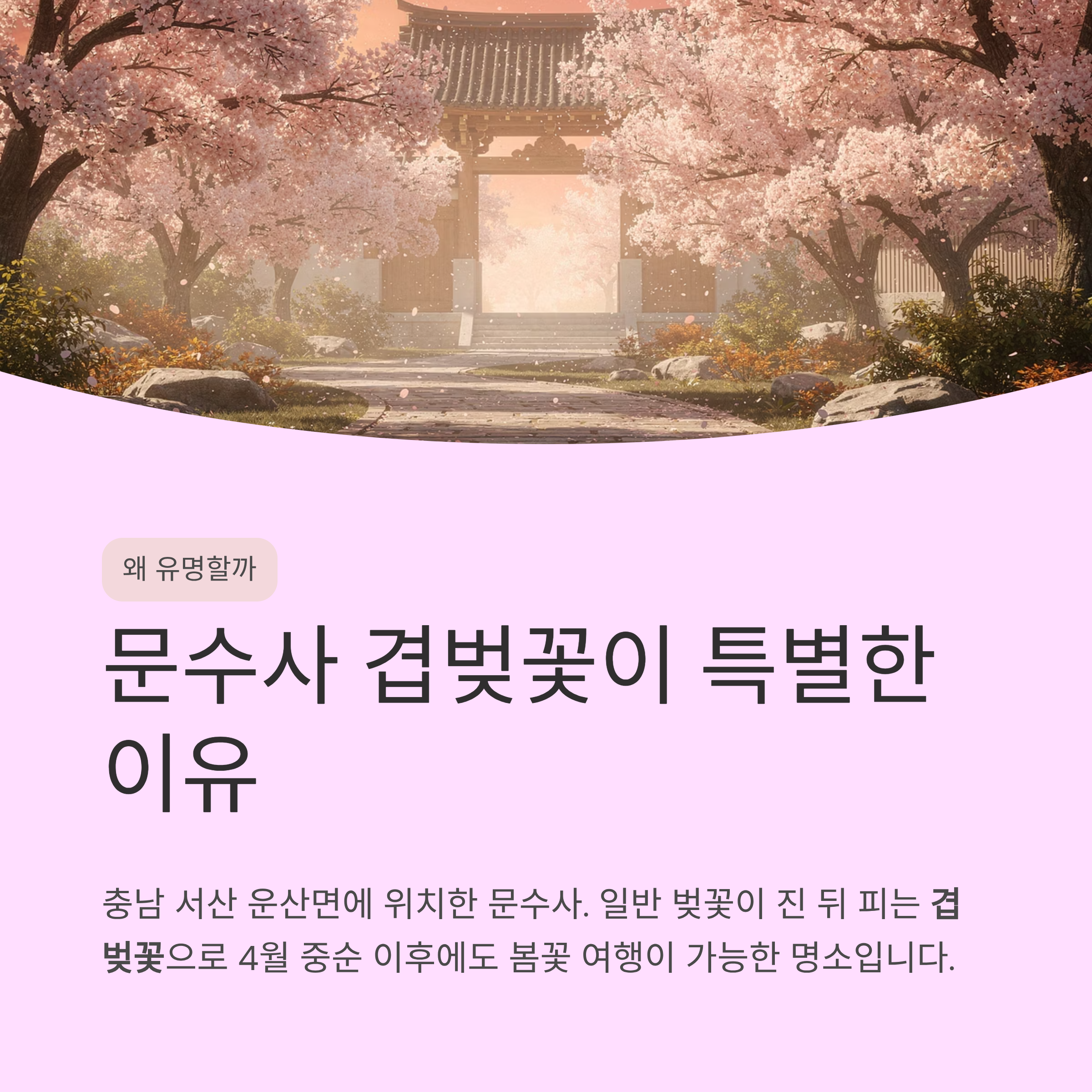 문수사는 충남 서산시 운산면에 있는 사찰로, 봄이면 절 입구부터 경내까지 겹벚꽃이 이어지는 풍경으로 유명합니다. 한국관광공사 여행기사와 충남 공식 콘텐츠에서는 문수사를 서산의 대표적인 겹벚꽃 명소로 소개하고 있으며, 일주문 진입로·극락보전 앞 공터·연못 주변·둘레길이 특히 보기 좋은 포인트로 언급합니다.