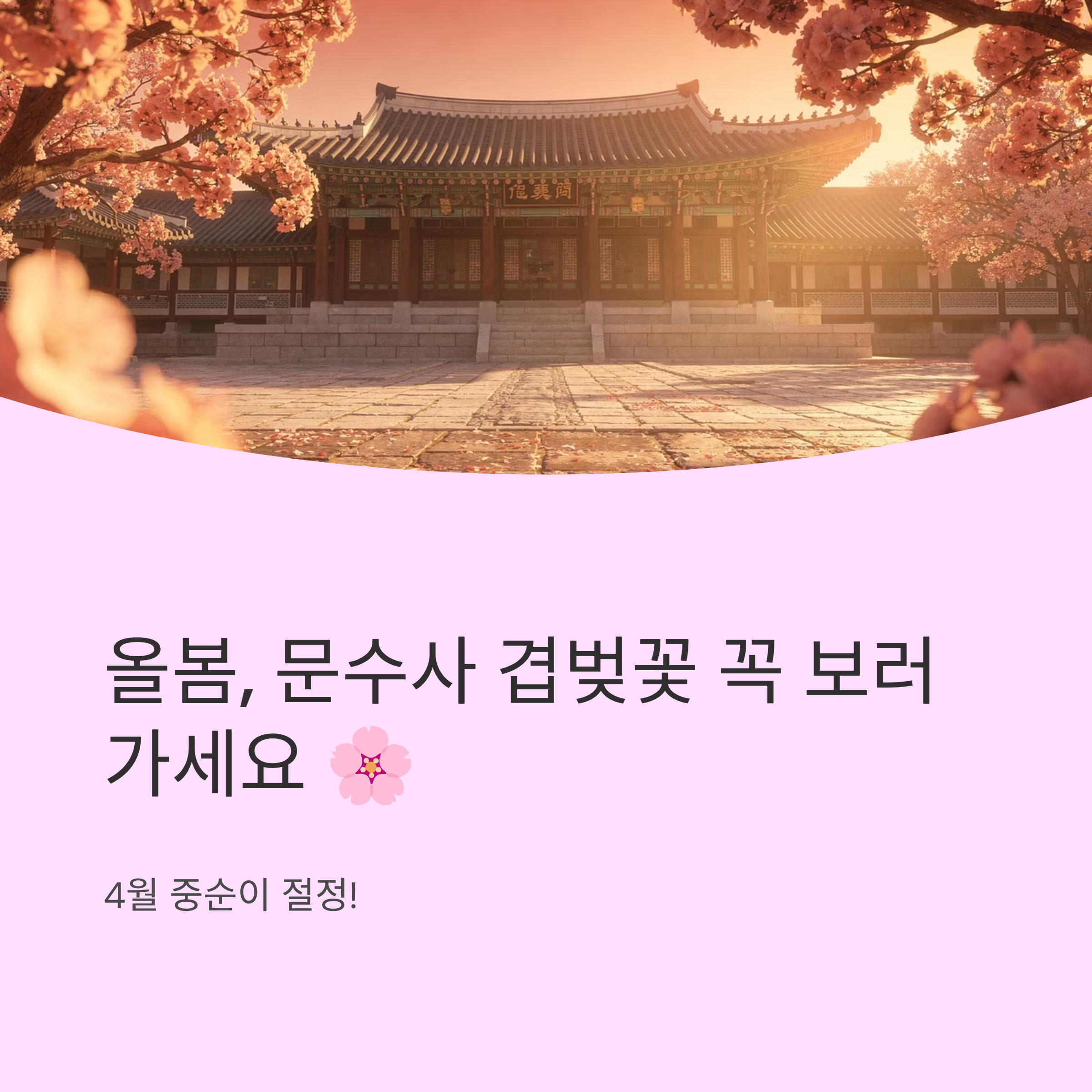 다만 개화는 기온과 강풍, 비 소식에 따라 바뀔 수 있습니다. 그래서 지금 시점에 방문을 계획한다면, 이번 주~다음 주 사이가 가장 유력한 관람 타이밍으로 보이지만, 현장 사진이나 최신 지역 소식을 한 번 더 체크하는 것이 안전합니다. 공식 관광 기사들도 문수사를 4월 중순부터 만개에 이르는 봄꽃 여행지로 소개하고 있습니다.
