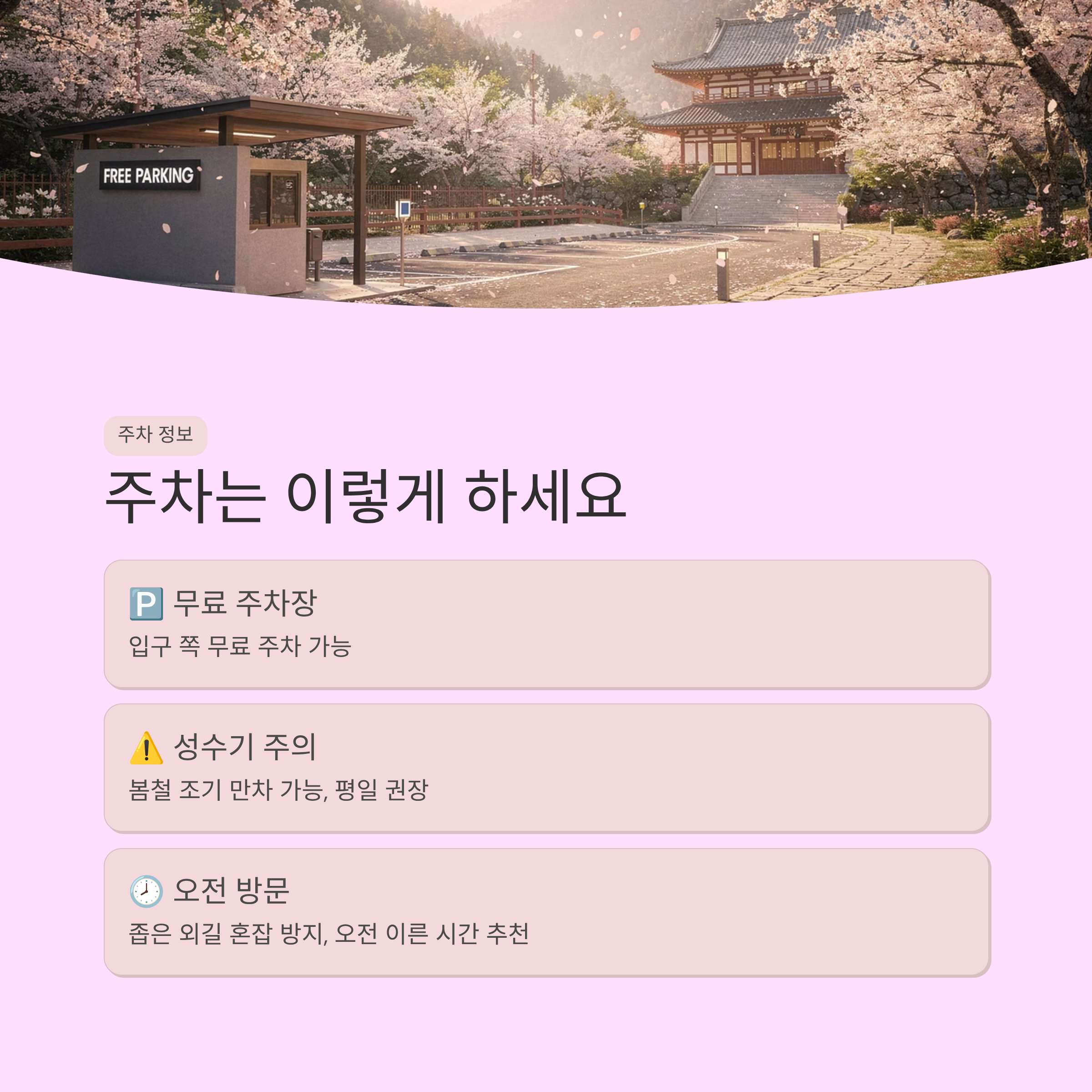 문수사는 봄철 특히 방문객이 몰리는 곳이라, 충남도 콘텐츠에서는 벚꽃 시즌에 문수사로 향하는 좁은 외길에 차량이 몰린다고 설명합니다. 따라서 주말 한낮보다는 오전 이른 시간이나 평일이 훨씬 편합니다. 주차 스트레스를 줄이려면 오전 방문이 가장 무난합니다.