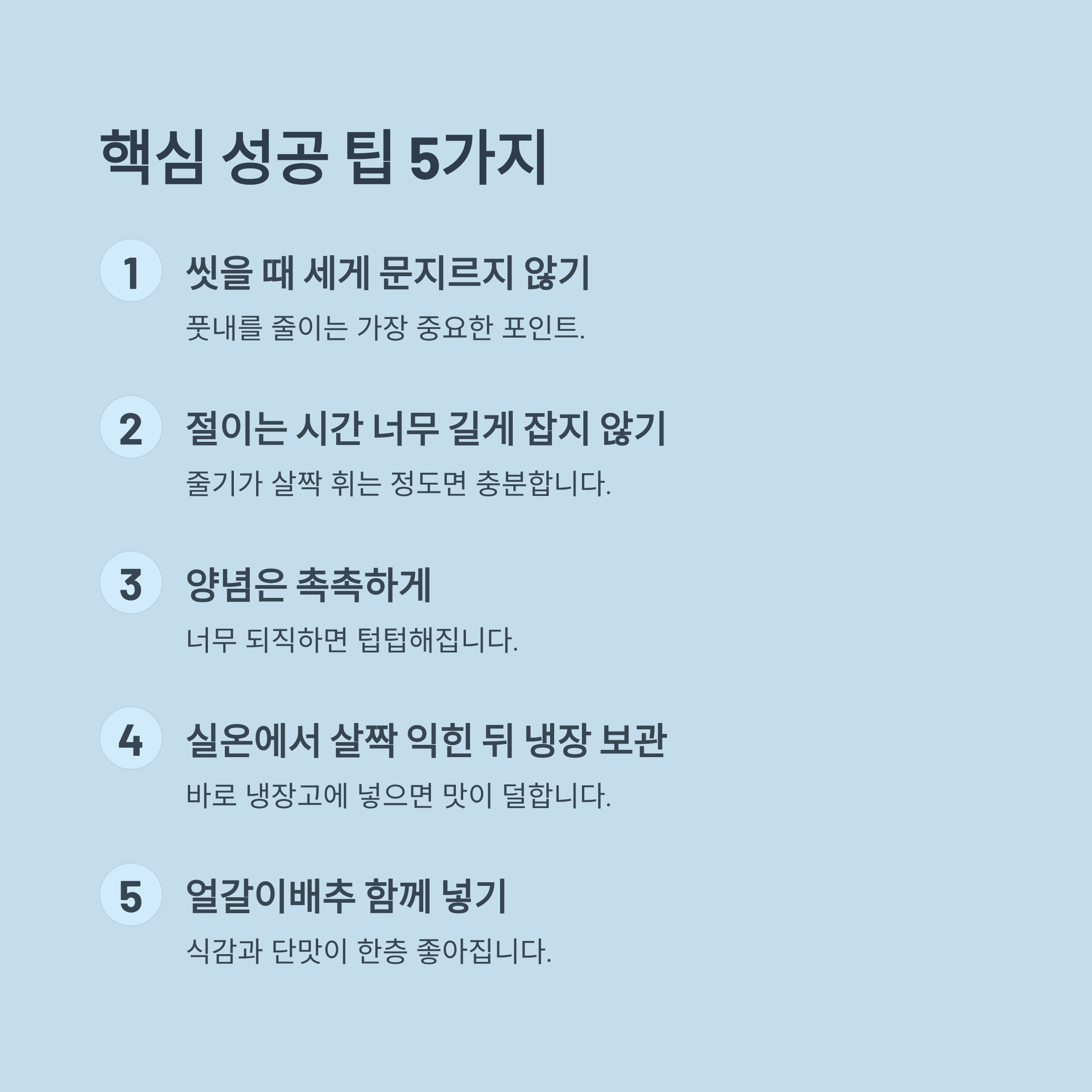 너무 약하게 절이면 풋내가 나고, 너무 오래 절이면 숨이 죽어 아삭함이 사라질 수 있습니다.