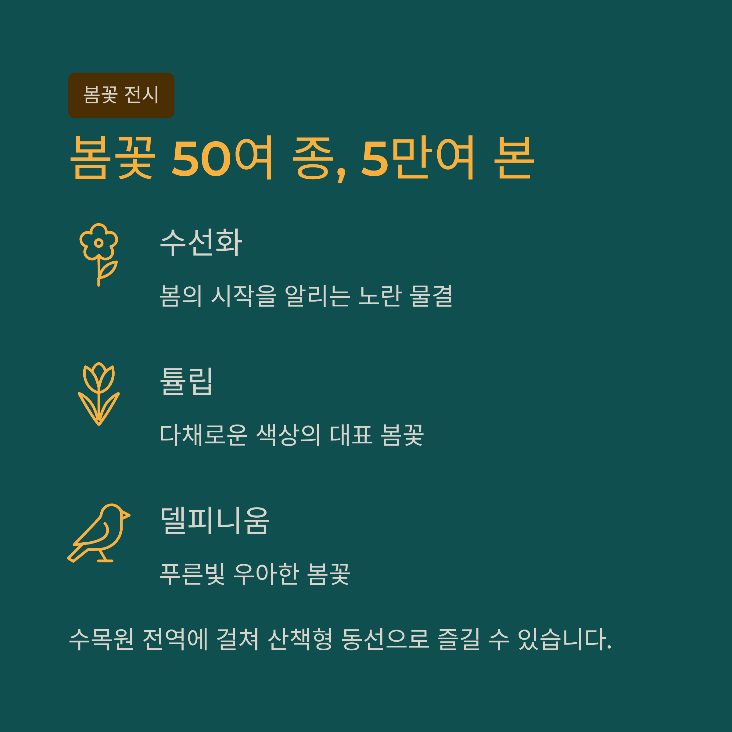 이번 축제에서는 수선화, 튤립, 델피니움을 포함한 봄꽃 50여 종 5만여 본이 수목원 전역에 전시됩니다. 봄철 대표 꽃들이 한 번에 모이는 만큼, 가족 나들이나 사진 촬영 목적 방문에도 잘 맞는 행사입니다.