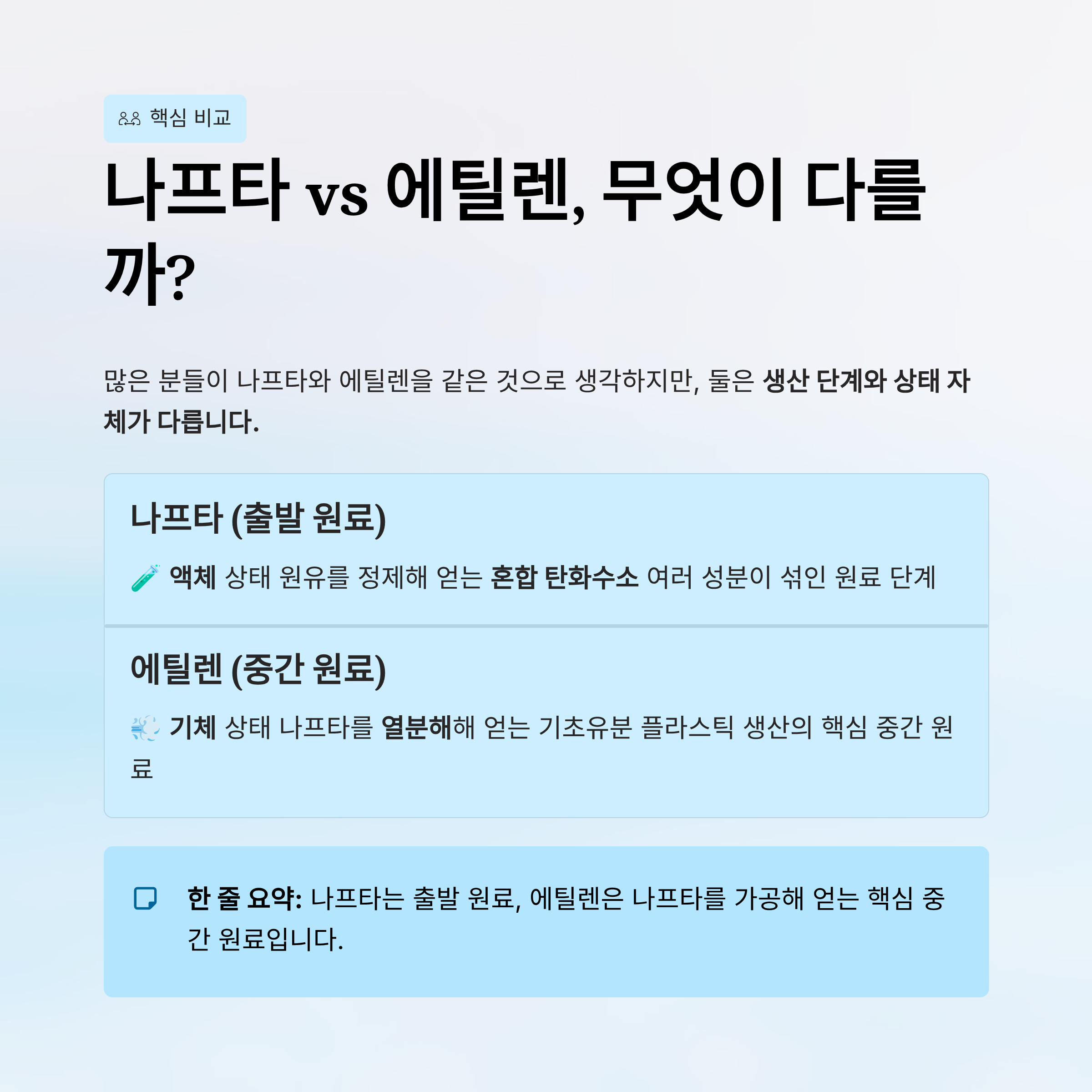 한마디로 정리하면, 나프타는 출발 원료, 에틸렌은 나프타를 가공해 얻는 핵심 중간 원료입니다.