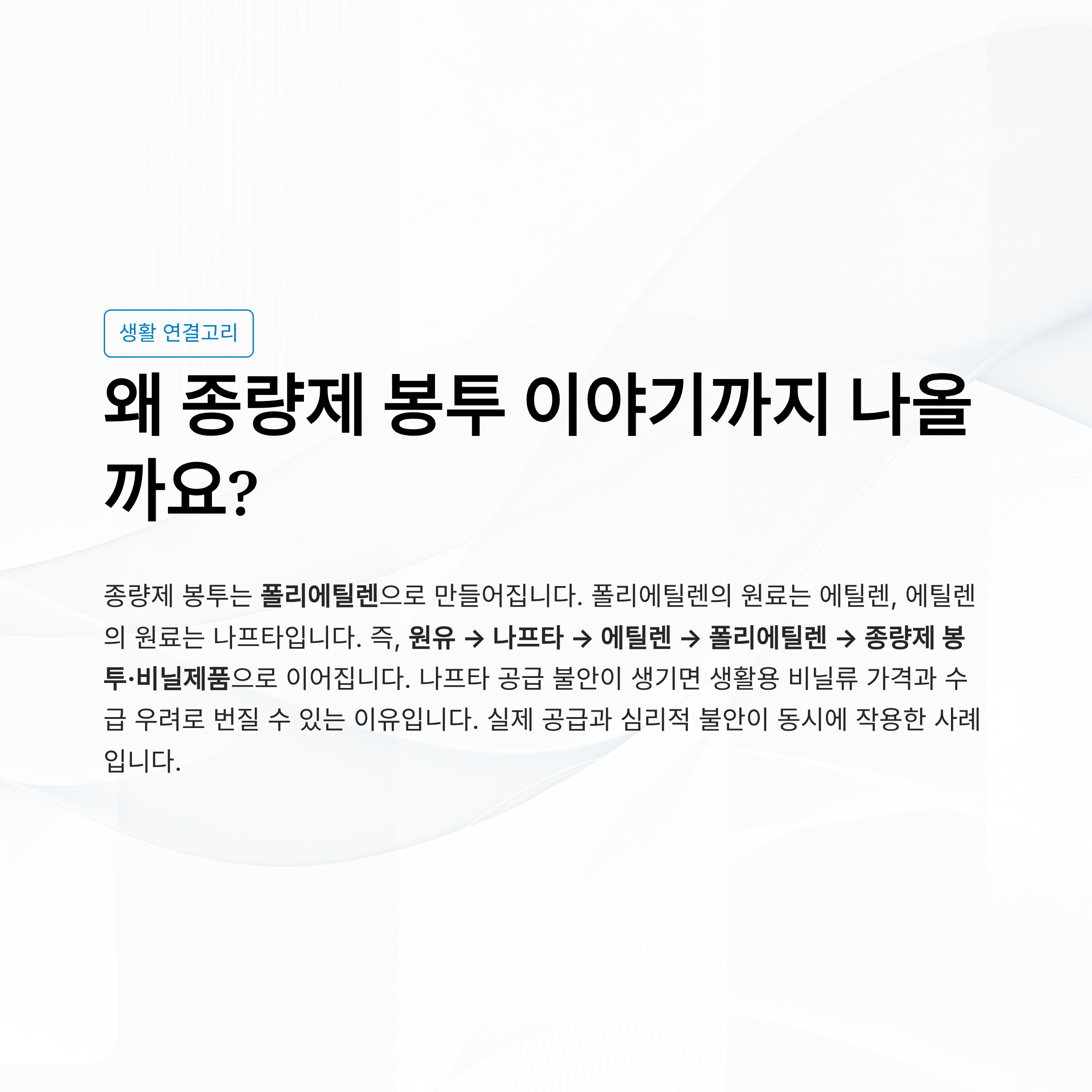 최근 국내외에서는 나프타 공급 불안이 생활용 비닐류 가격과 수급 우려로 번질 수 있다는 보도가 이어졌습니다. 한국에서는 일부 지역에서 종량제 봉투 사재기성 수요가 발생했고, 정부와 지자체는 전체 공급에는 문제가 없다는 입장을 내놨습니다. 즉 실제 공급 문제와 심리적 불안이 동시에 작용한 사례로 볼 수 있습니다.