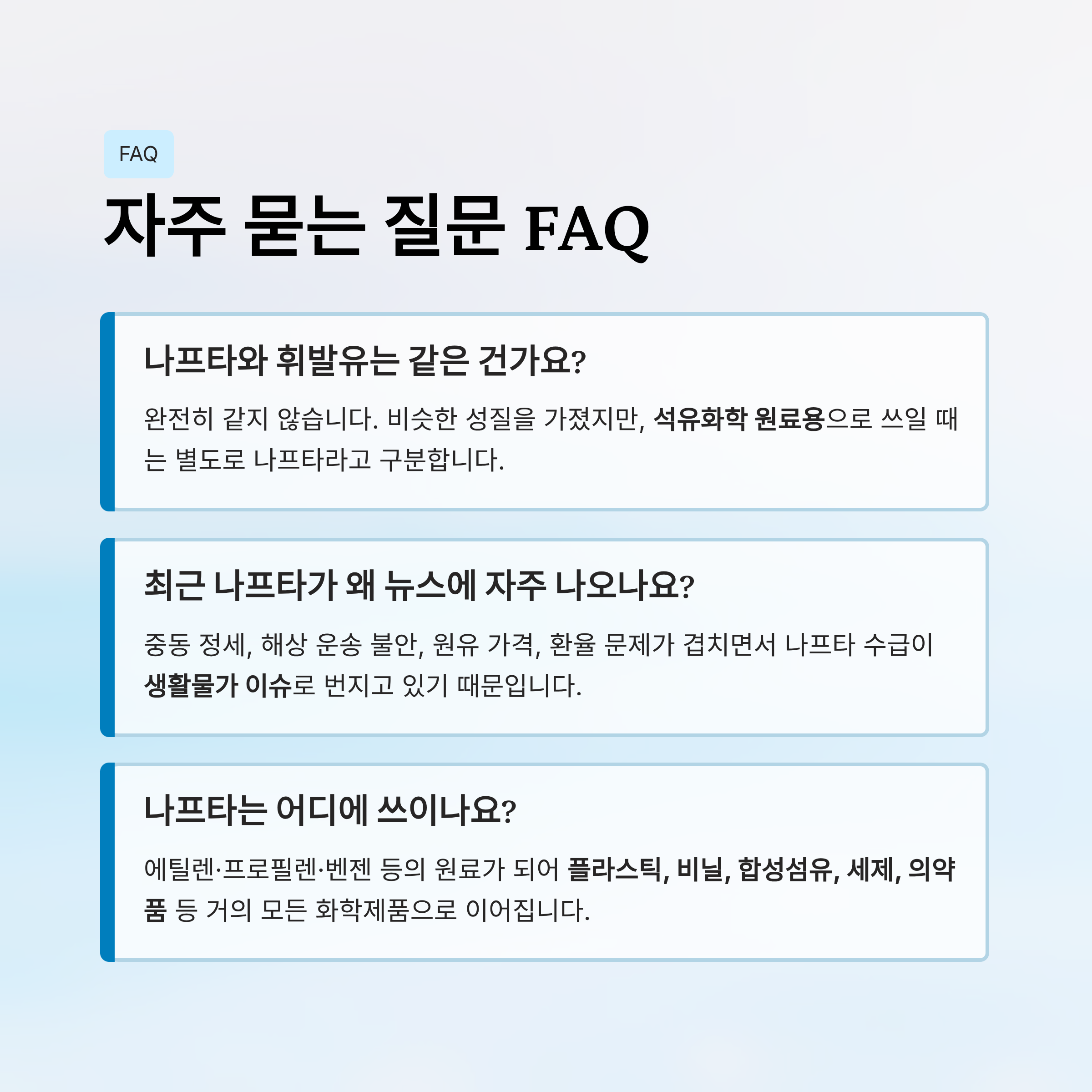 반대로 나프타 수급이 안정되면 석유화학 원료 가격도 차츰 진정될 가능성이 있습니다. 결국 나프타는 일반 소비자가 직접 사는 제품은 아니지만, 생활물가 뒤에 숨어 있는 핵심 원료라고 이해하면 쉽습니다.