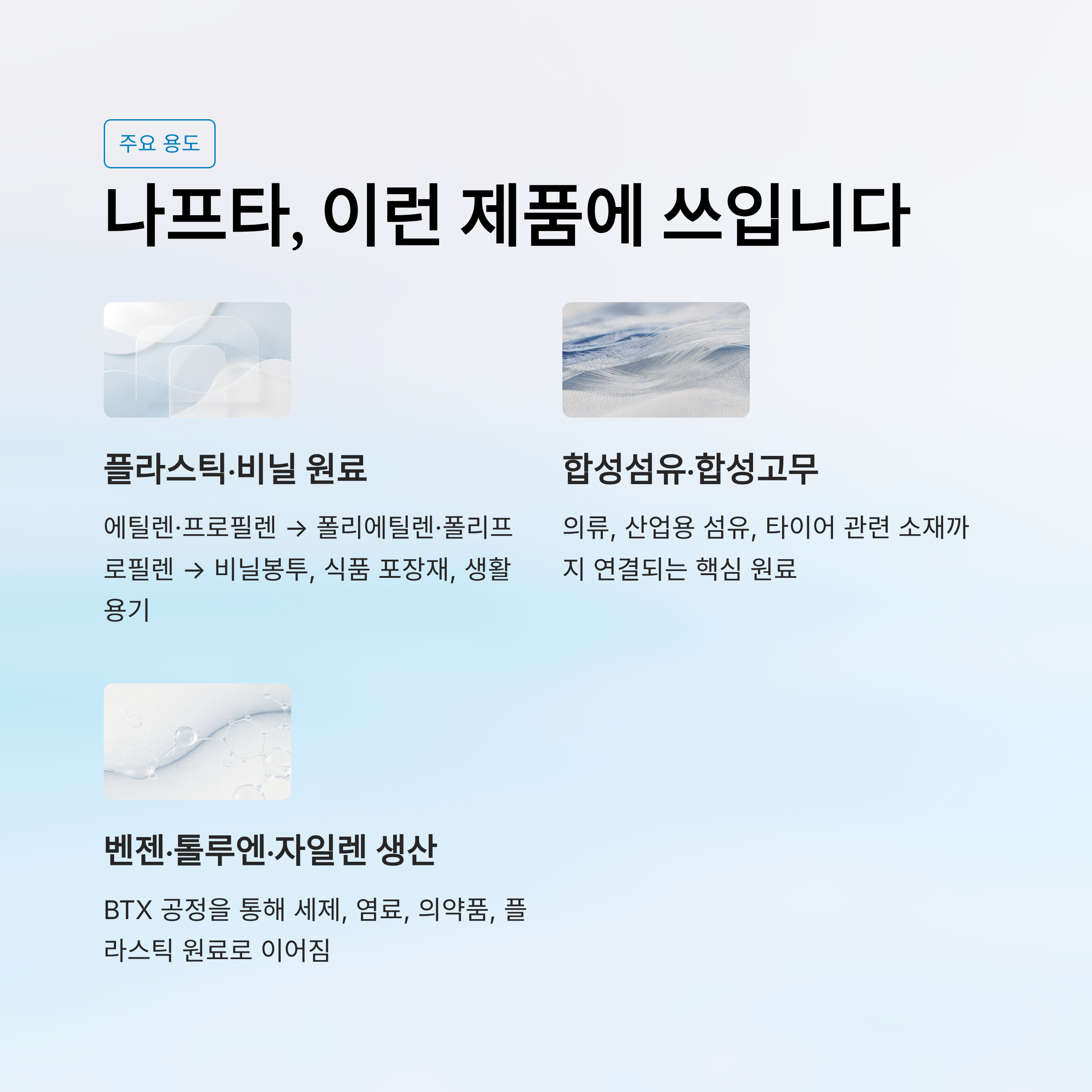 에틸렌, 프로필렌, 벤젠, 톨루엔, 자일렌 같은 기초유분과 방향족 화합물을 만드는 데 쓰입니다. 이후 플라스틱, 비닐, 합성섬유, 합성고무, 세제, 의약품 원료로 이어집니다.