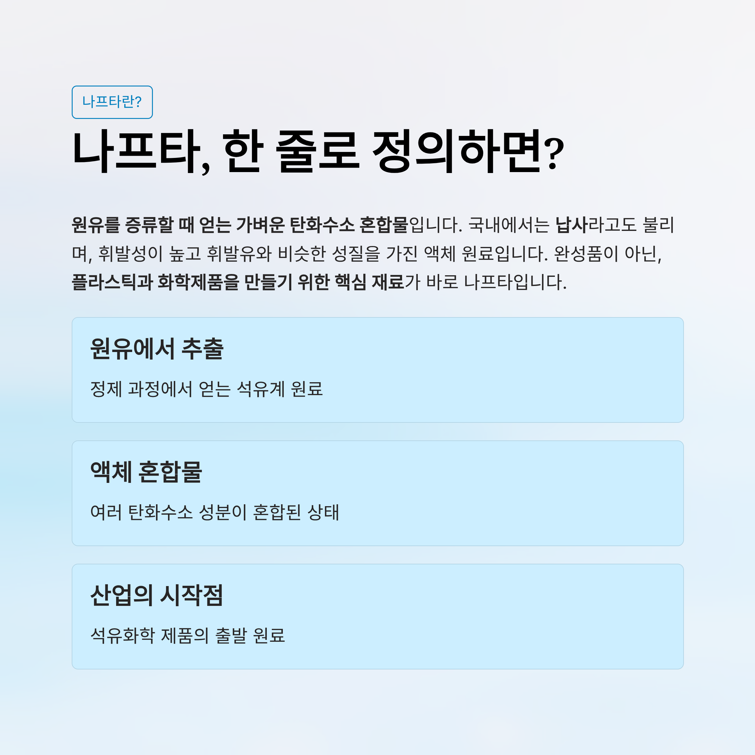 나프타는 원유를 증류할 때 얻는 가벼운 탄화수소 혼합물입니다. 국내 업계에서는 흔히 납사라고도 부르며, 휘발성이 높고 휘발유와 비슷한 성질을 가진 액체 원료로 설명됩니다. 대한석유협회와 업계 자료에 따르면 나프타는 석유화학 제품을 만드는 핵심 출발 원료로 쓰입니다.