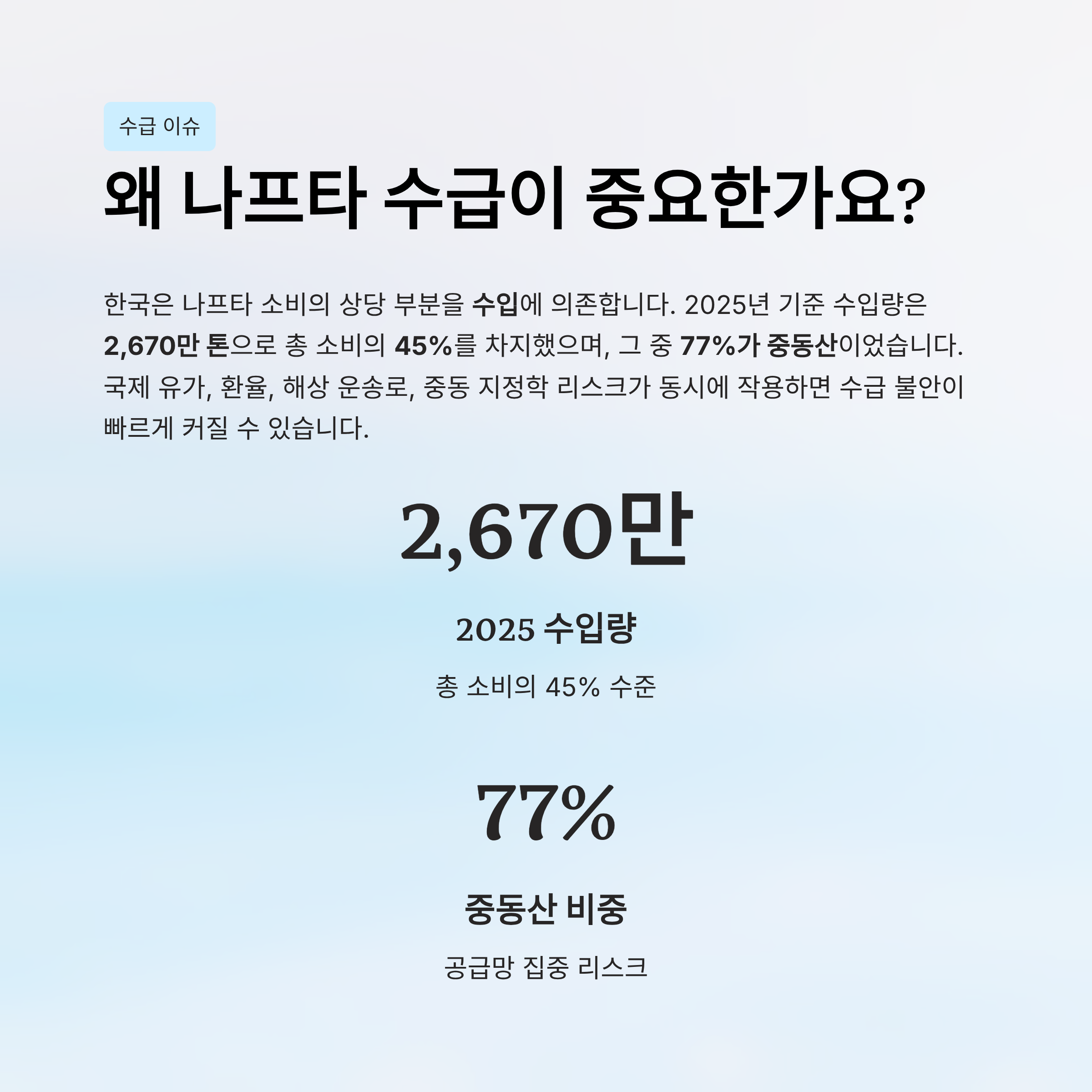 중동 정세, 해상 운송 불안, 원유 가격, 환율, 국내 석유화학 공급망 문제가 겹치면서 나프타 수급과 가격이 생활물가 이슈로 번지고 있기 때문입니다. 최근 한국 정부가 수입 지원과 수출 제한 조치를 내놓은 것도 이런 배경입니다.